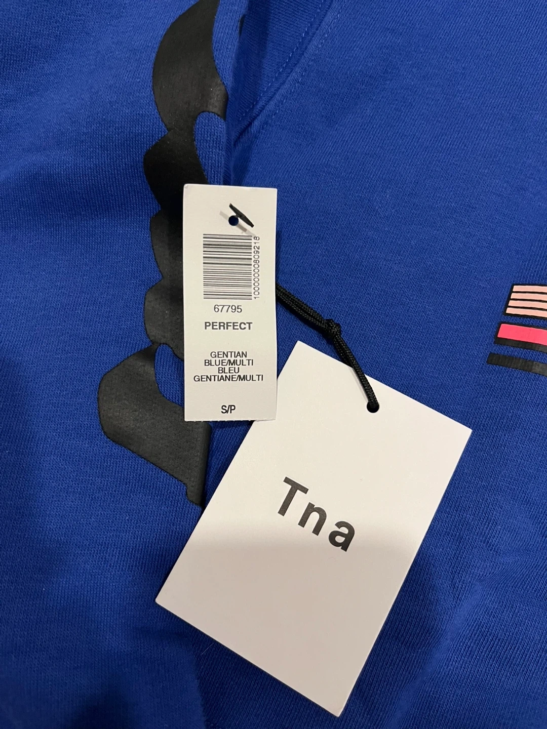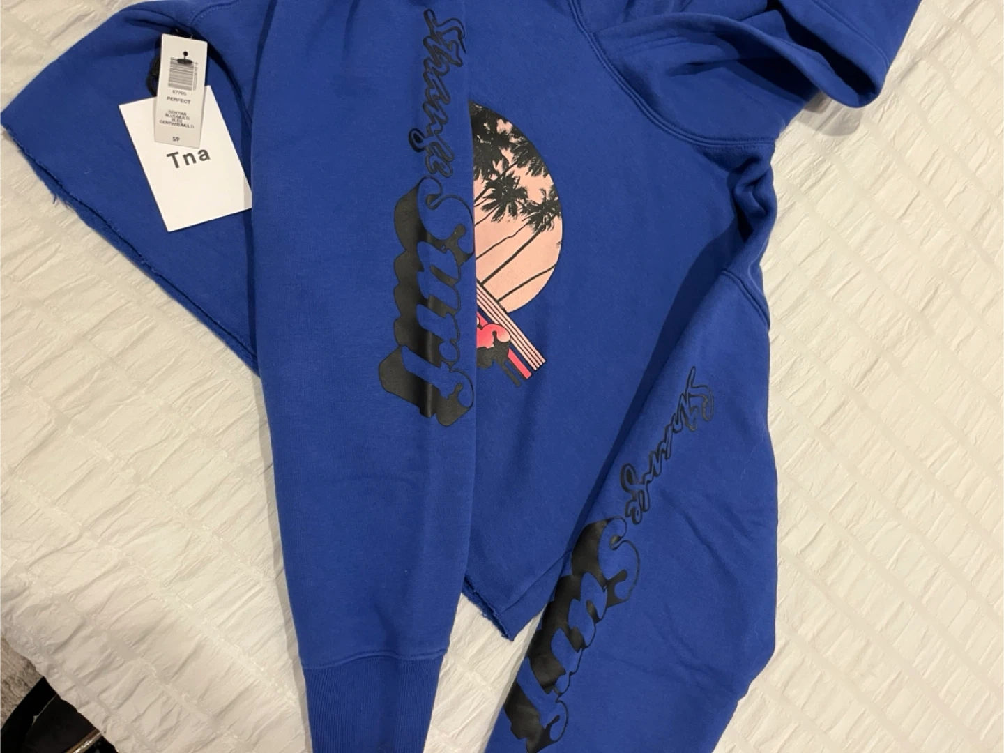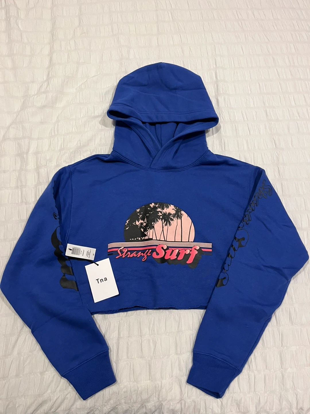 This is a brand new cropped hoodie from Tna with a "Strange Surf" graphic. It's bright blue and features a sunset graphic with palm trees on the front and text graphics down the sleeves. The material is a soft cotton blend. Perfect for casual wear!