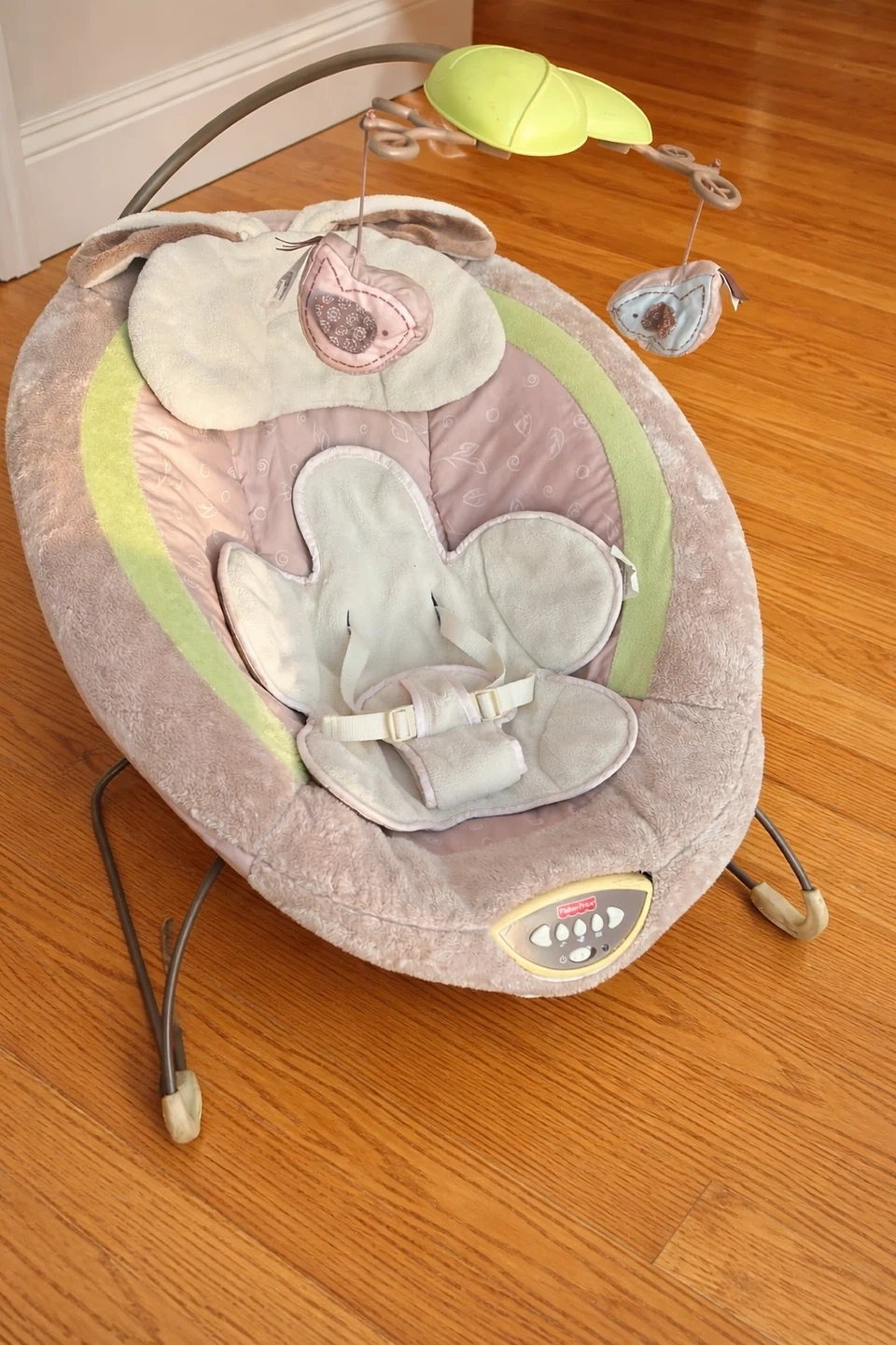 Fisher-Price bouncer seat in a neutral beige and green colour. It has plush fabric and a three-point harness for safety. Includes a mobile with hanging toys. This is great for keeping little ones entertained and comfortable.