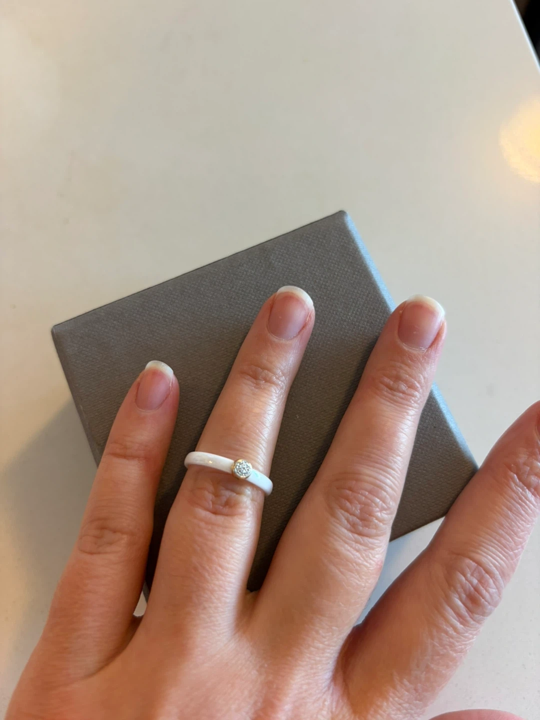 Sleek ceramic ring accented with genuine 14K yellow gold and natural diamonds (approx. 0.02 ct). In perfect condition—modern, elegant, and great for everyday wear or stacking.