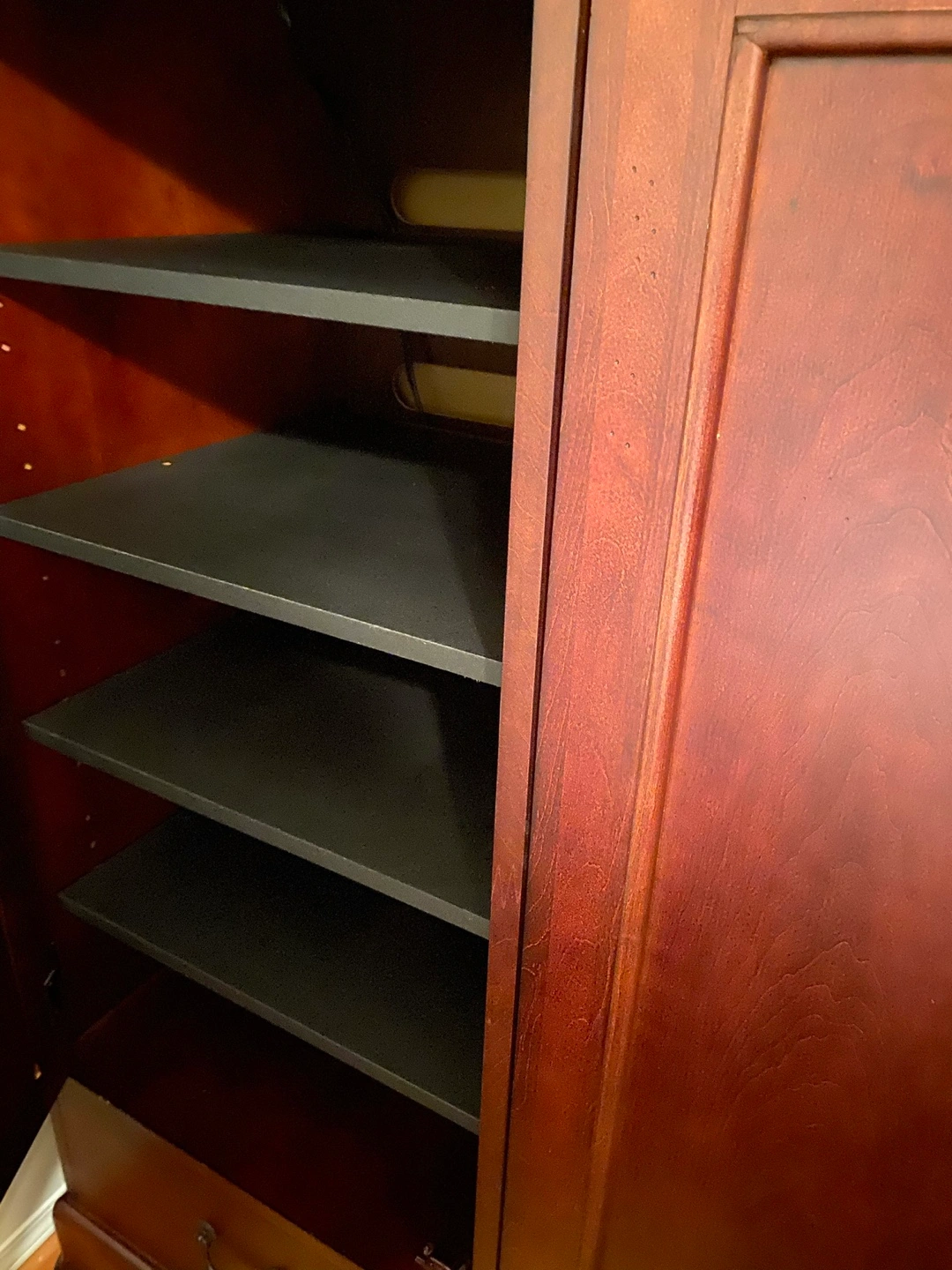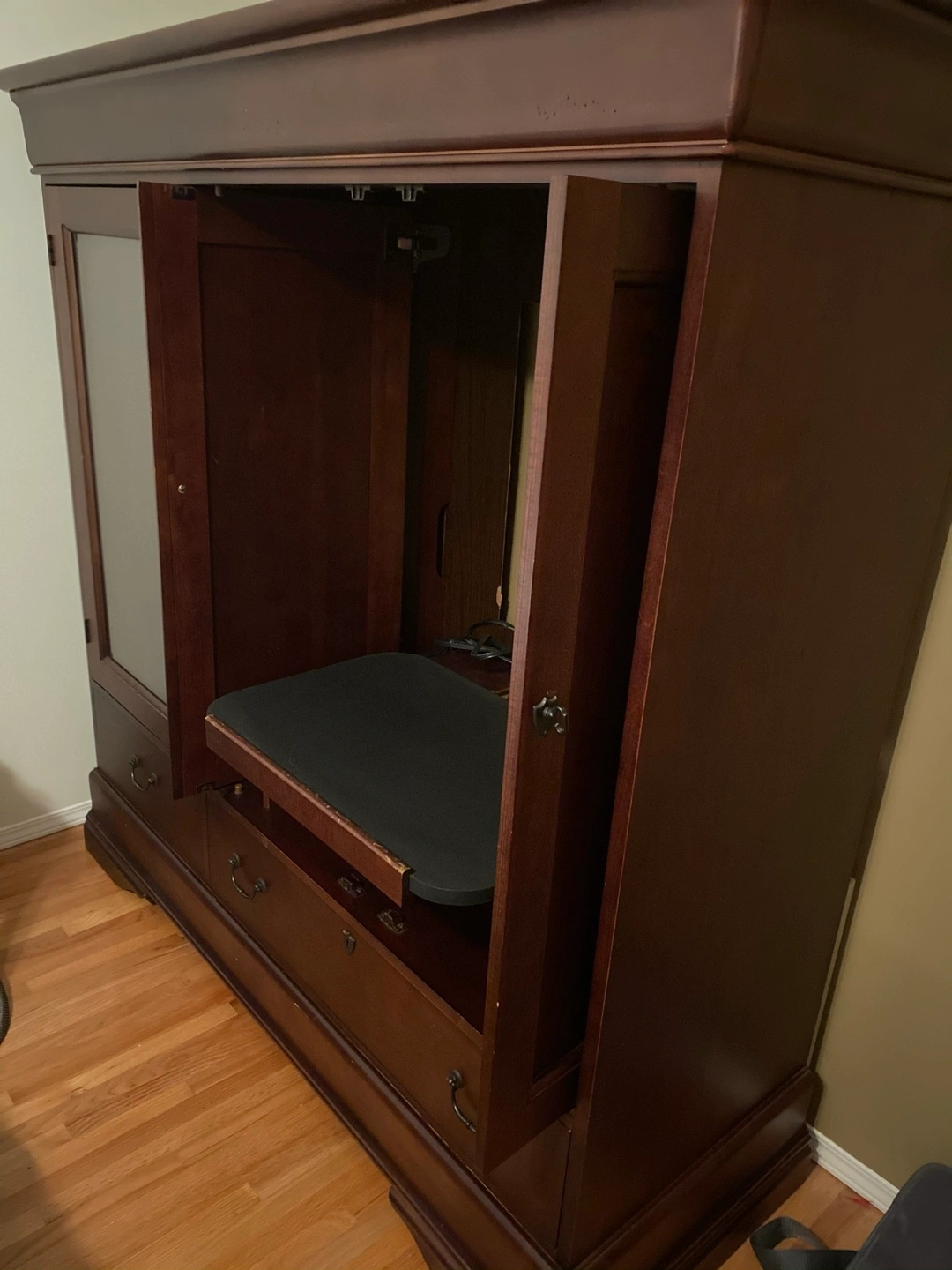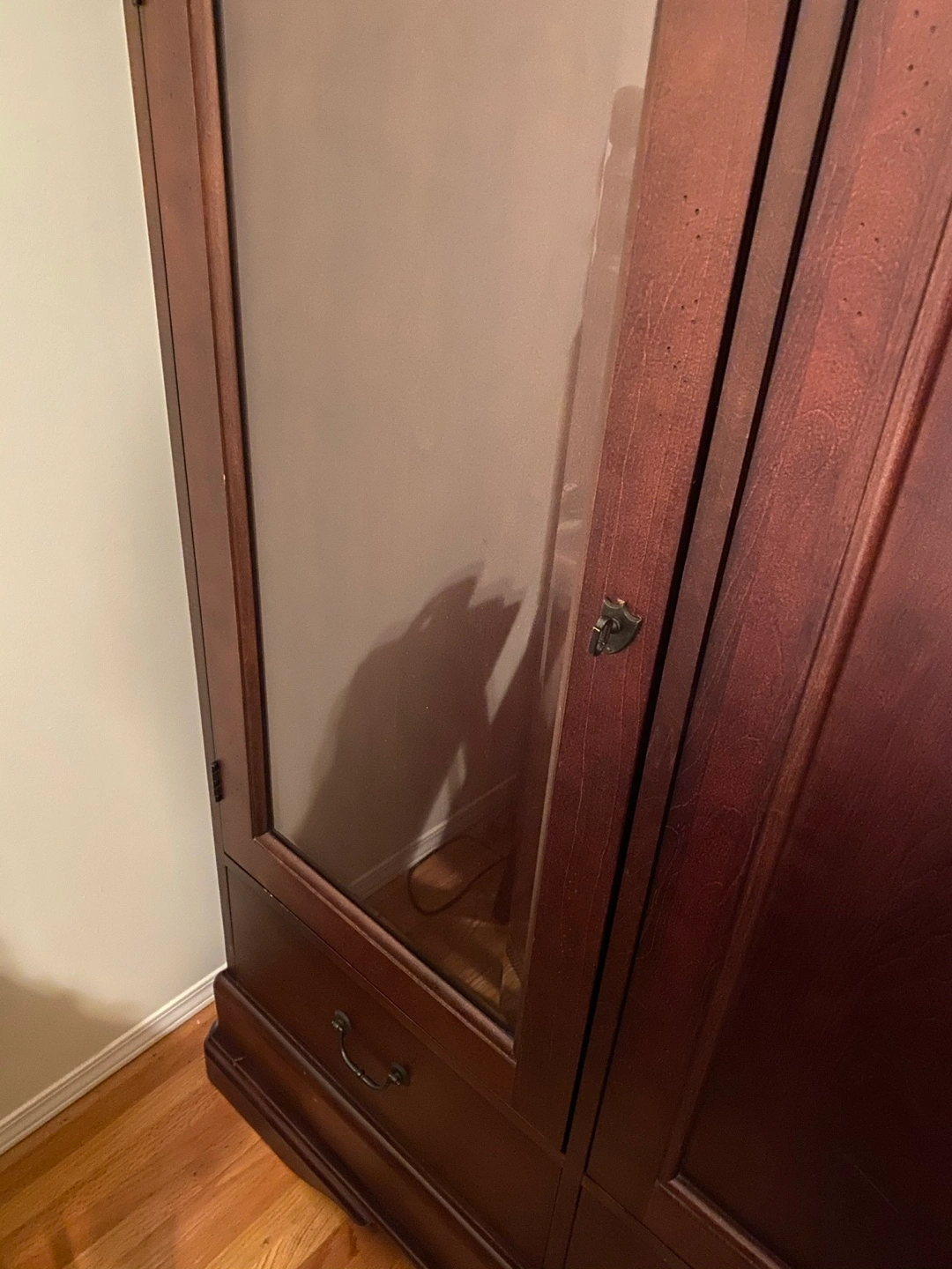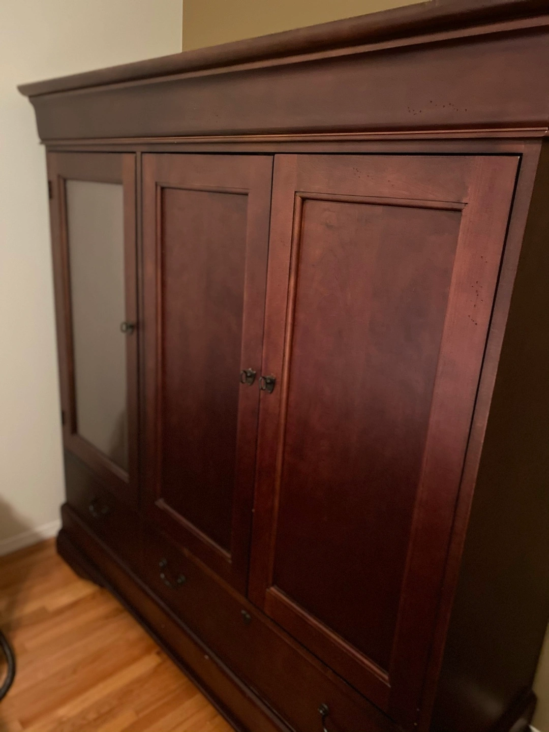 Selling a lovely wooden armoire in a rich brown colour. It features multiple doors, drawers, and a glass panel on one side. Perfect for adding storage and style to any bedroom or living space!