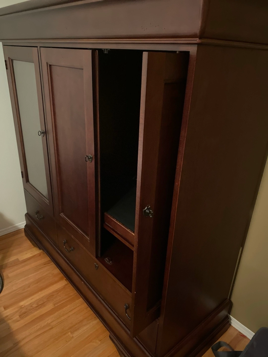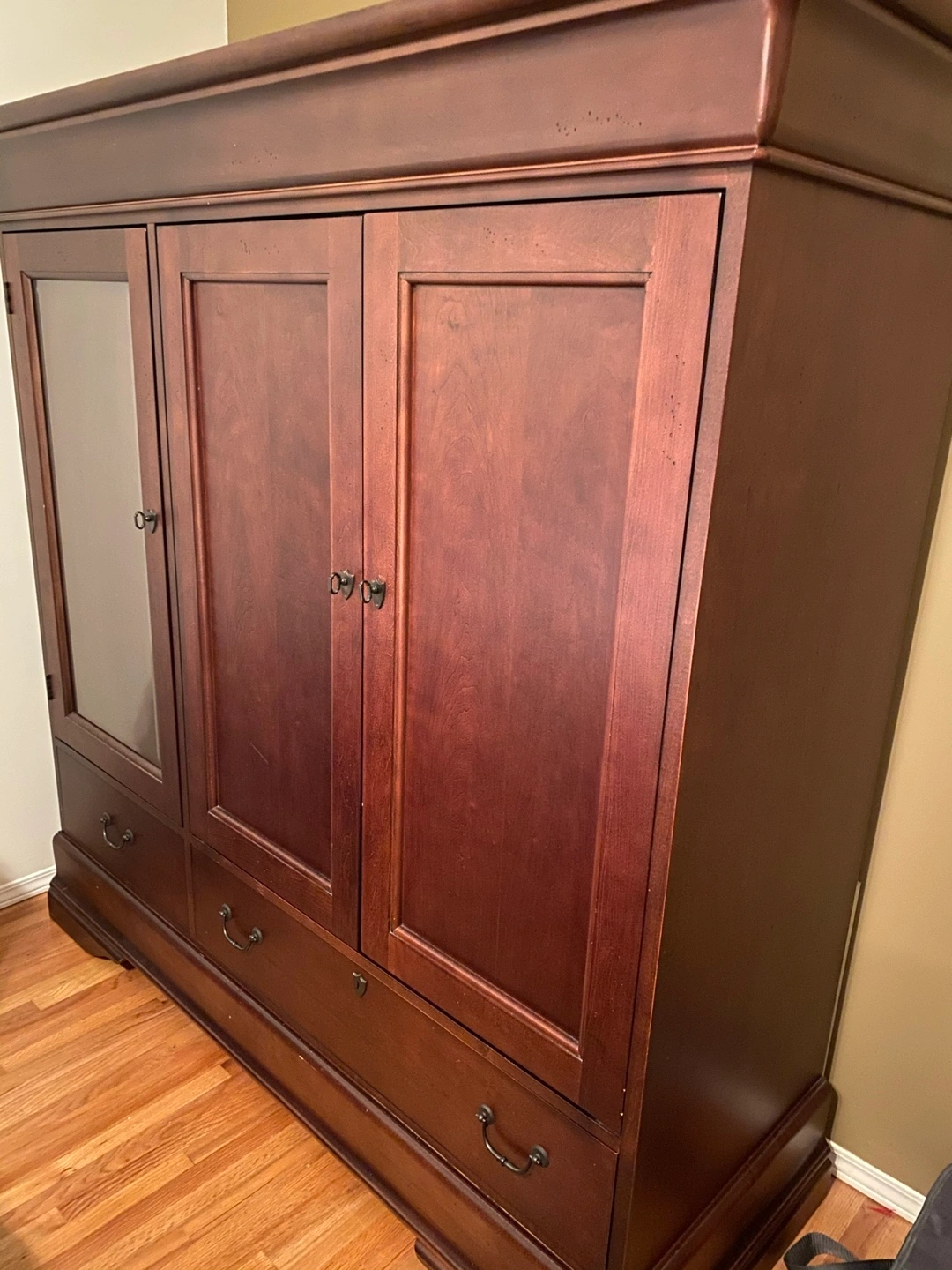 Selling a lovely wooden armoire in a rich brown colour. It features multiple doors, drawers, and a glass panel on one side. Perfect for adding storage and style to any bedroom or living space!
