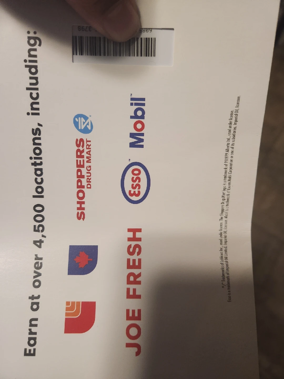 25giving a PC Optimum points card that can be used at various locations including Shoppers Drug Mart, Esso, Mobil, and Joe Fresh