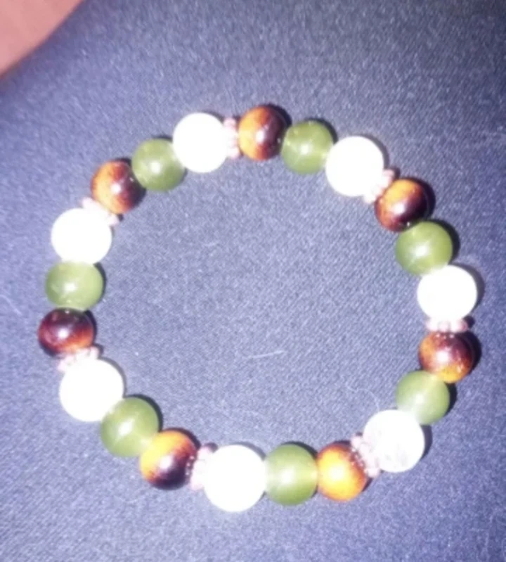 Set of two elastic beaded bracelets. One with moonstone beads while the other has a mix of green jade, clear quartz, and tiger's eye beads. $5 for 1 or $10 for each. Taking offers