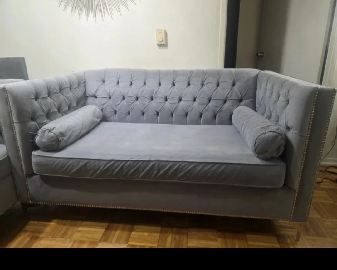 Light Grey Tufted Sofa with Bolster Pillows