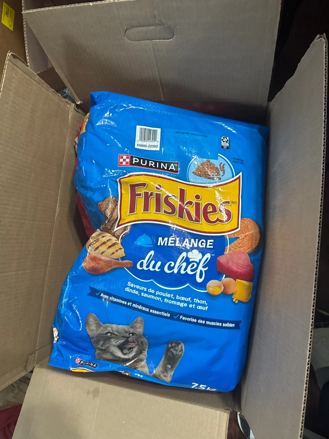 Purina Friskies Mélange du Chef cat food. Flavours of chicken, beef, tuna, turkey, salmon, cheese, and egg. It contains essential vitamins and minerals and supports strong muscles. 7.5 kg bag.