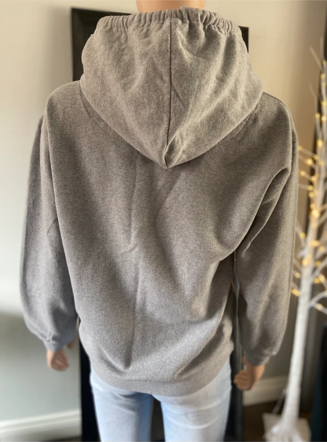 The hoodie has a drawstring hood and two front pockets