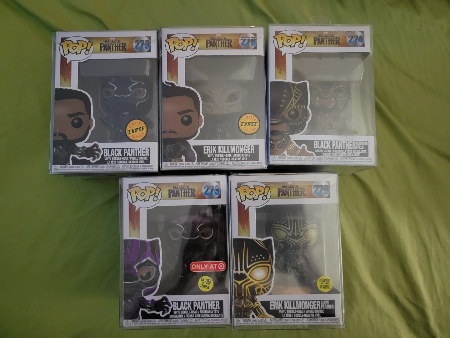 This lot includes five Funko Pop! vinyl bobble-head figures from Marvel's Black Panther. Two are limited chase editions, and two glow in the dark. Collectible figures for fans of the movie!