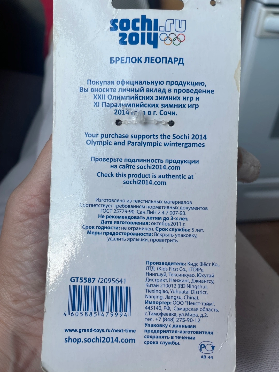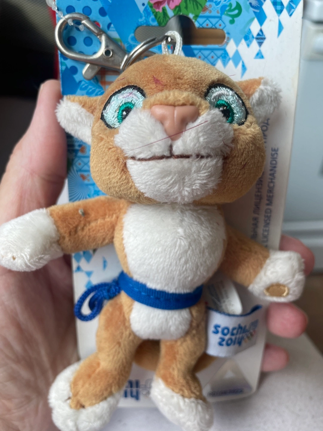 Adorable plush leopard keychain. Officially licensed Sochi 2014 Winter Olympics merchandise. Features a small blue ribbon around its waist. Collectible souvenir. Pickup and cash only
