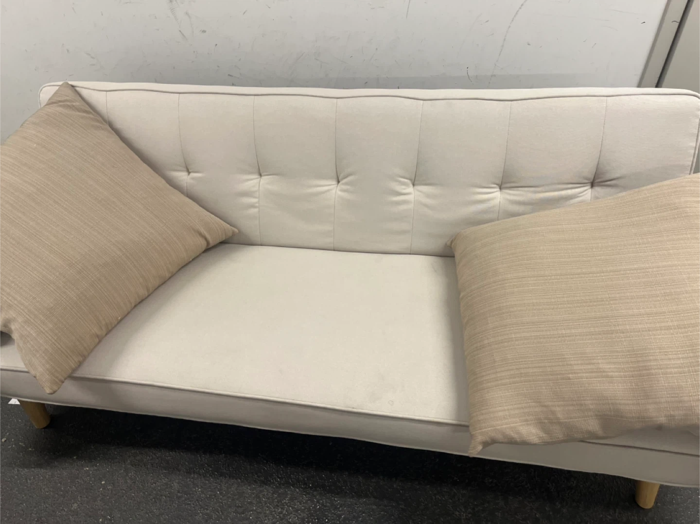 This futon sofa is a light cream or off-white colour. It includes two matching throw pillows with a subtle striped pattern. The sofa has tufted detailing on the backrest and arms. Its legs are made of wood. This piece is suitable for a living room or guest room.