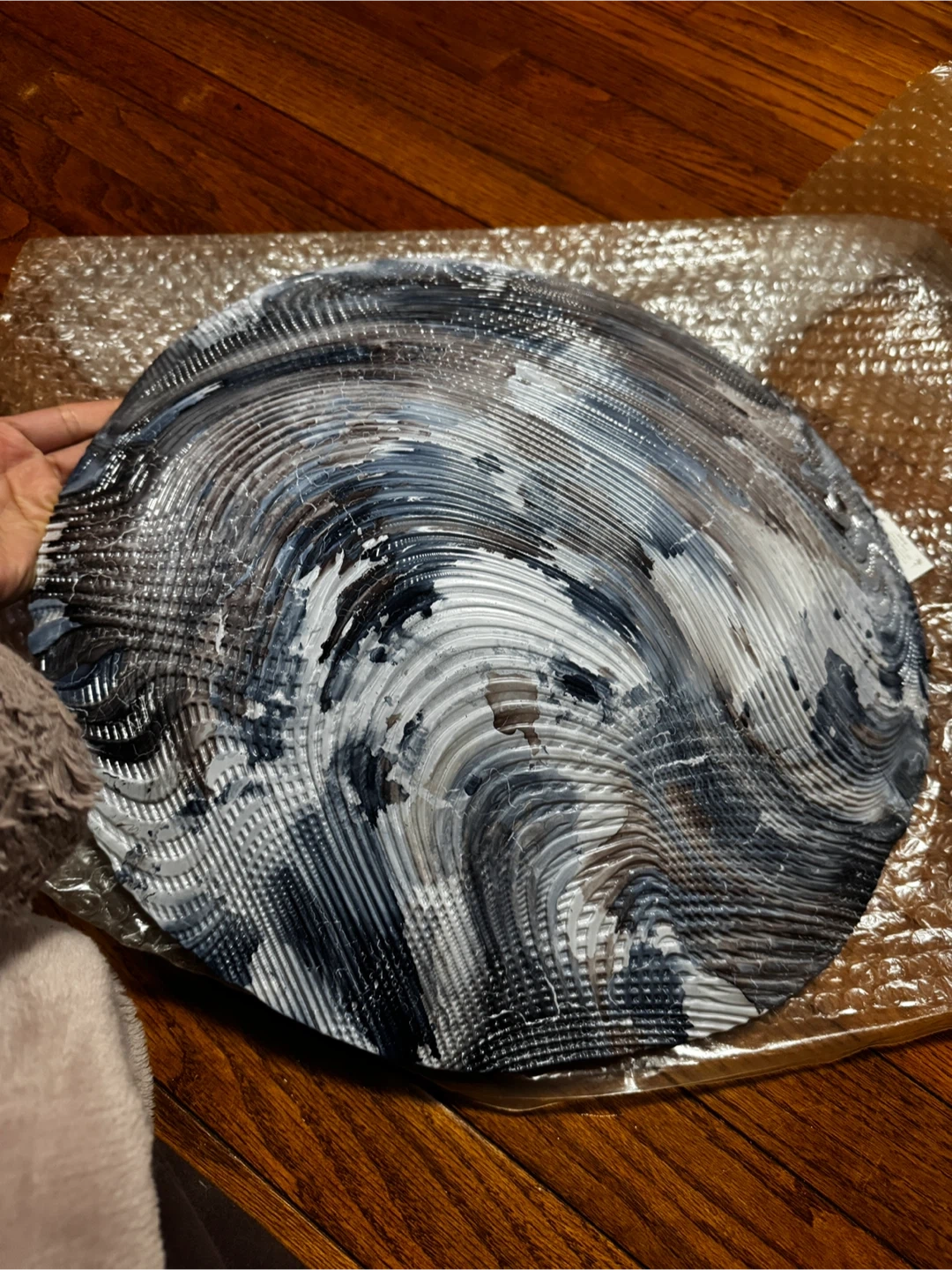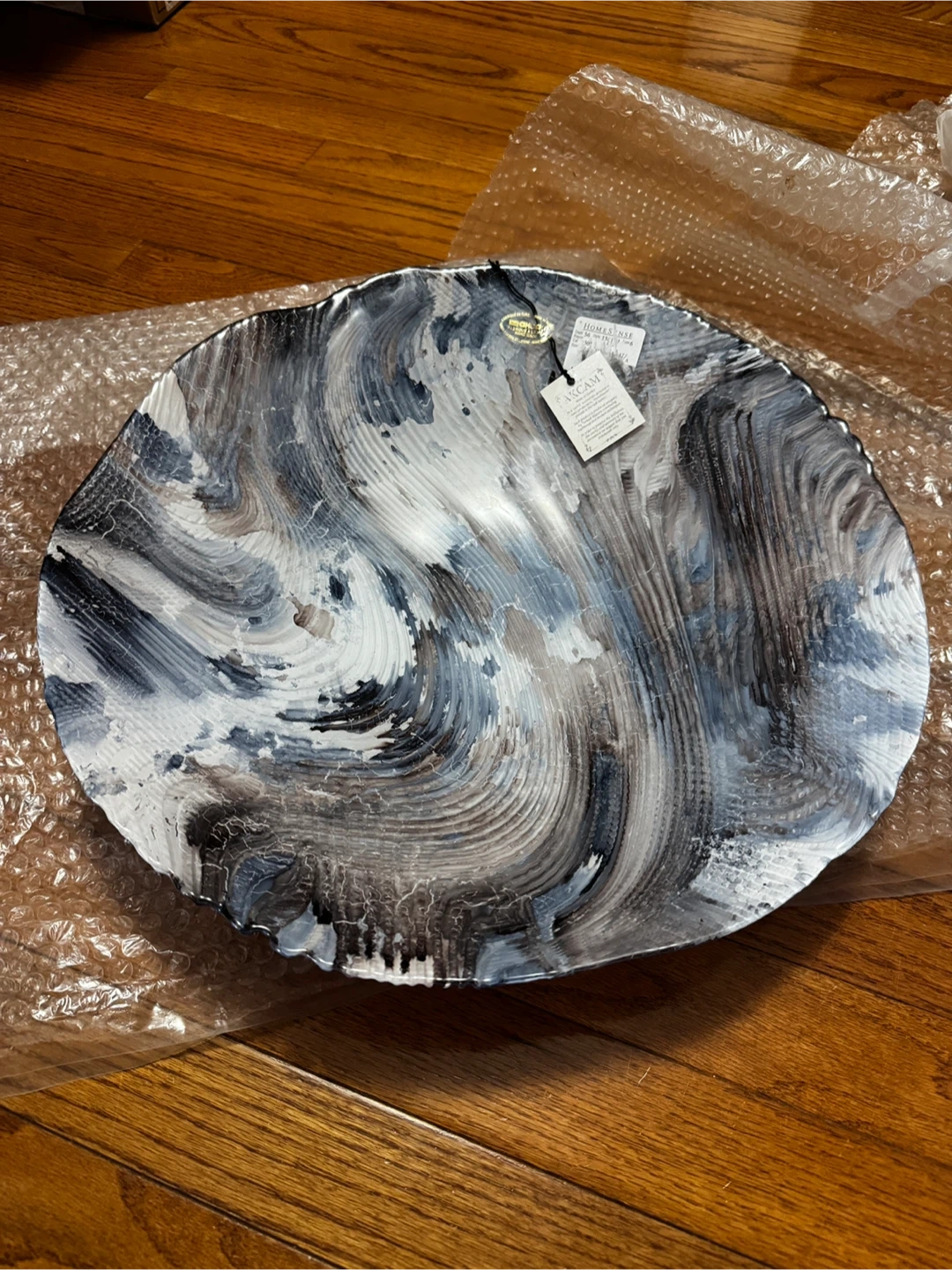 A decorative accent dish with a swirled abstract pattern in grey, white, and black tones. It's made of ceramic and has a unique textured surface. This dish would make a striking centrepiece on a table or shelf. Made it Turkey.