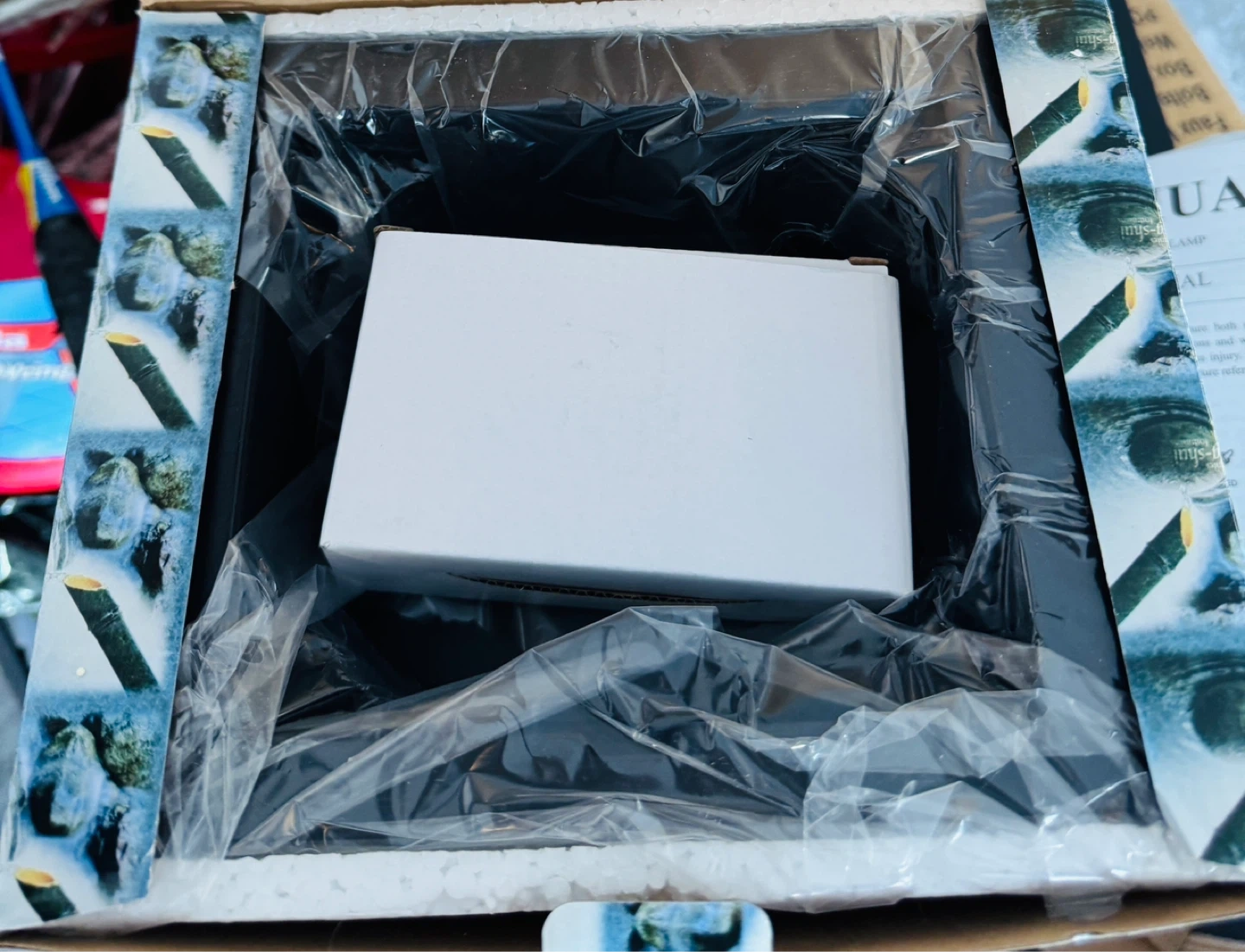 A tabletop Feng Shui fountain with multiple tiers. It's designed to create a calming atmosphere. Includes a small white box inside, likely for a pump or adapter.