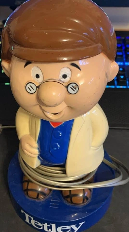 Unique Tetley Tea Folk Gaffer phone. Vintage landline phone. Full keypad and ringer on/off switch. Coiled cord wrapped around the base.