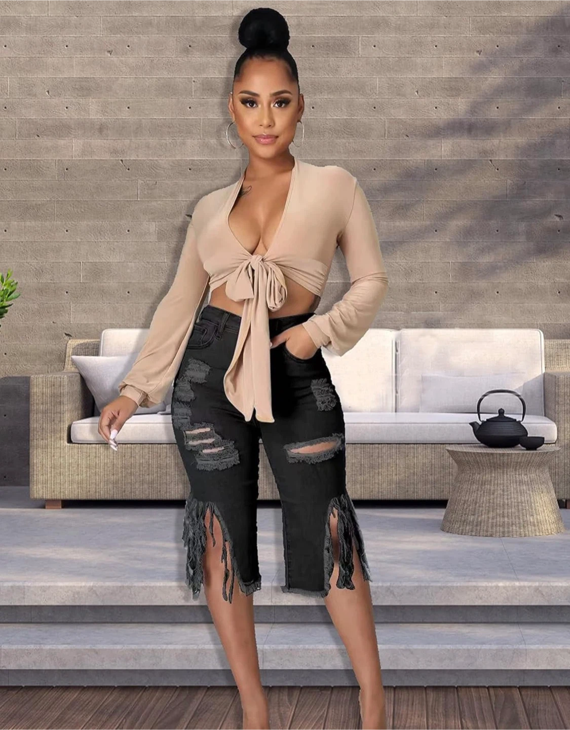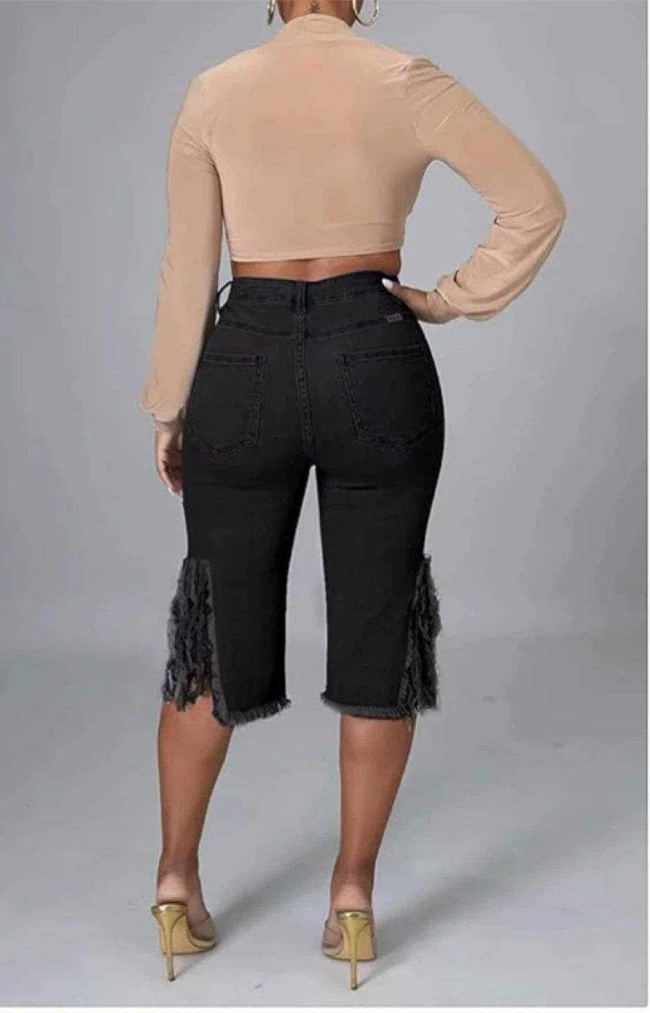 Women Tassel Ripped Knee Length Jeans Shorts Fringed Broken Capri Denim Pant.