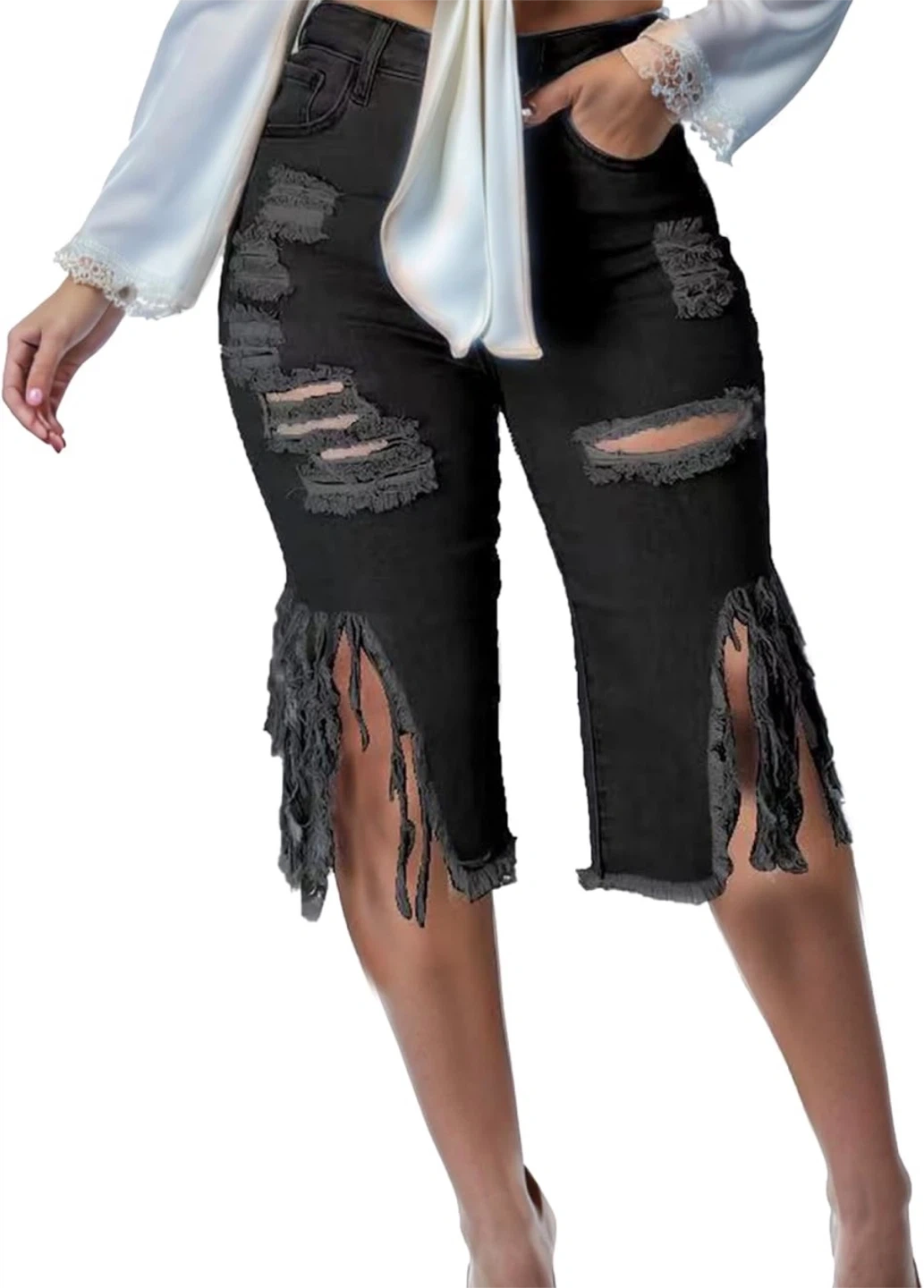 Women Tassel Ripped Knee Length Jeans Shorts Fringed Broken Capri Denim Pant.