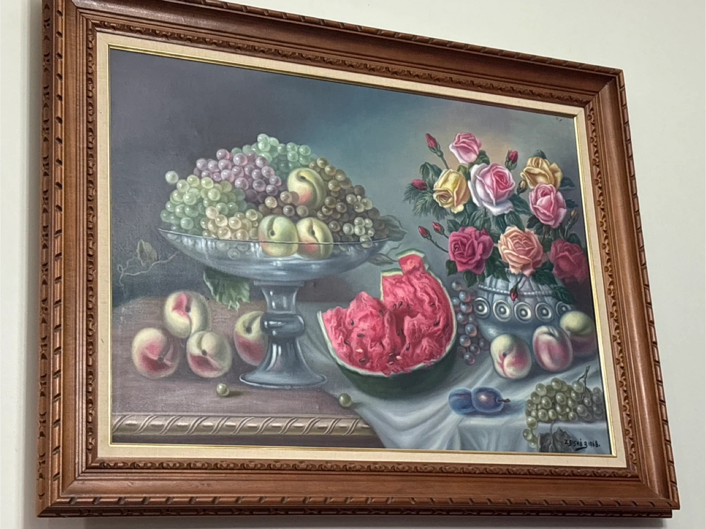 This framed oil painting depicts a vibrant still life with a bowl of grapes, peaches, and a sliced watermelon, alongside a bouquet of roses. The artwork is housed in a decorative wooden frame. It's signed and dated 1968.