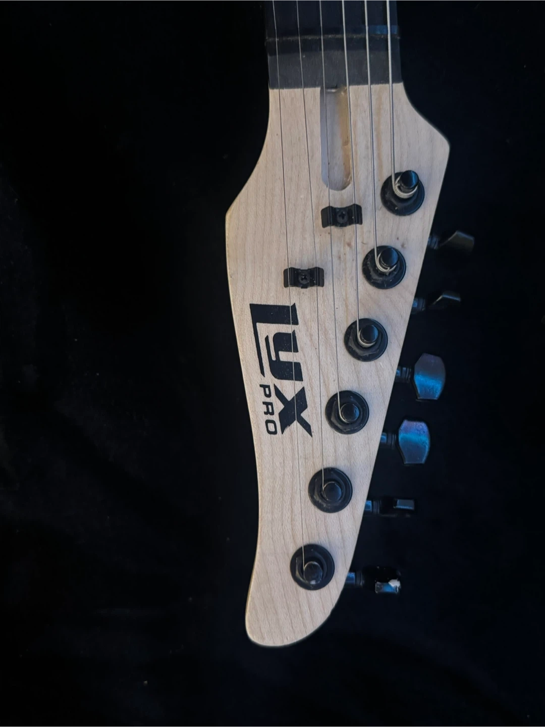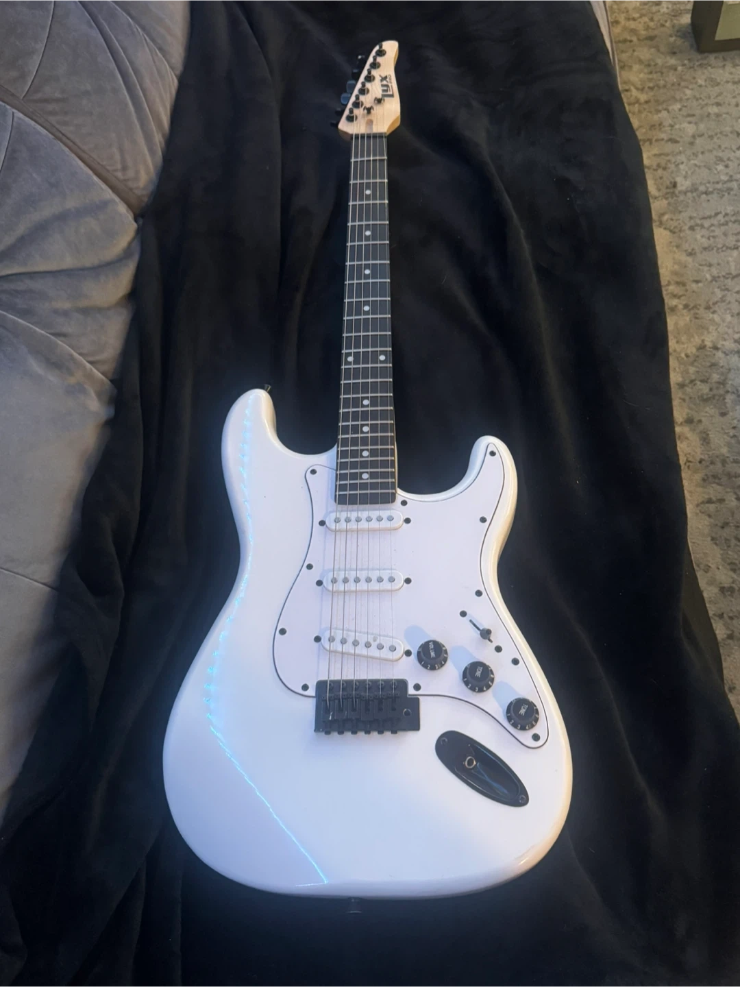 This is a white LyxPro electric guitar. It has a maple neck and a rosewood fretboard. The guitar features three single-coil pickups and a tremolo bridge. It's ready for practice or performance!