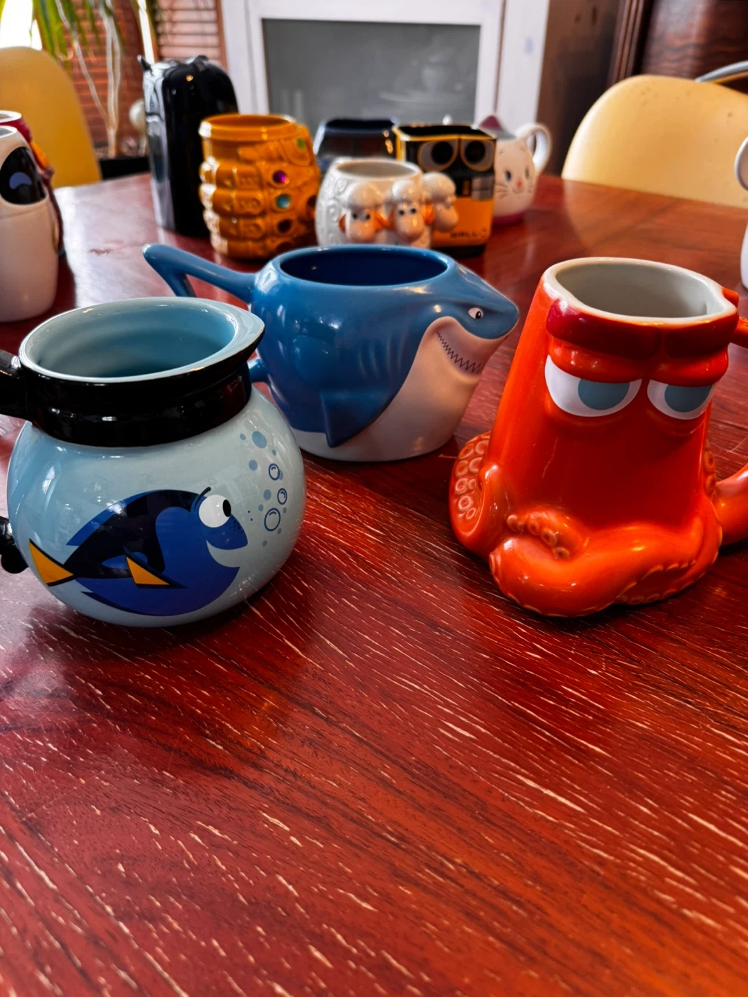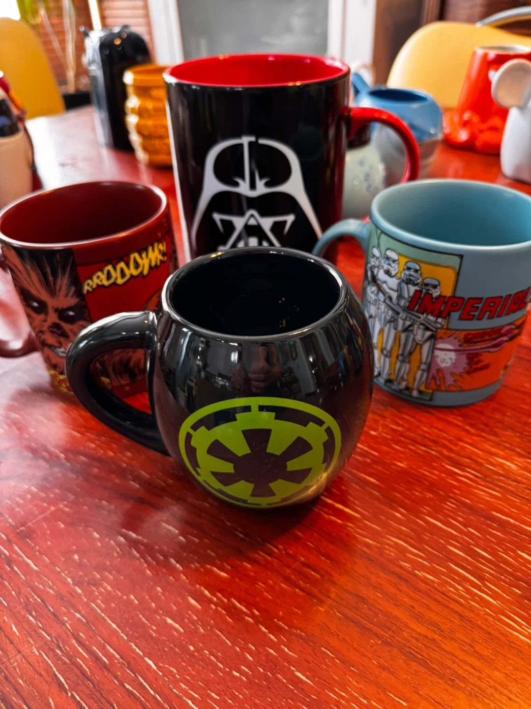 Collection of fun Star Wars and Disney character mugs. Includes Darth Vader, Stormtroopers, Mickey Mouse, Pluto, and more. Ceramic material.