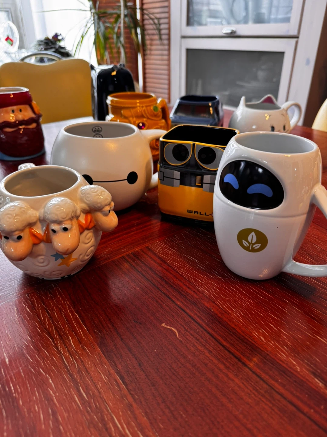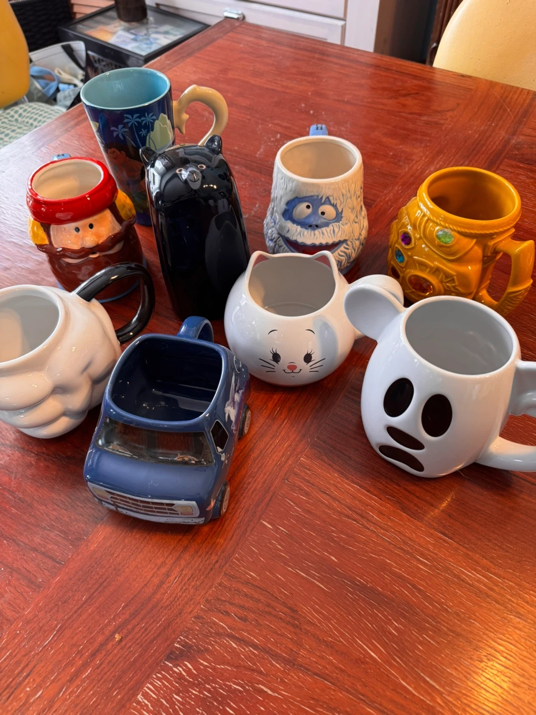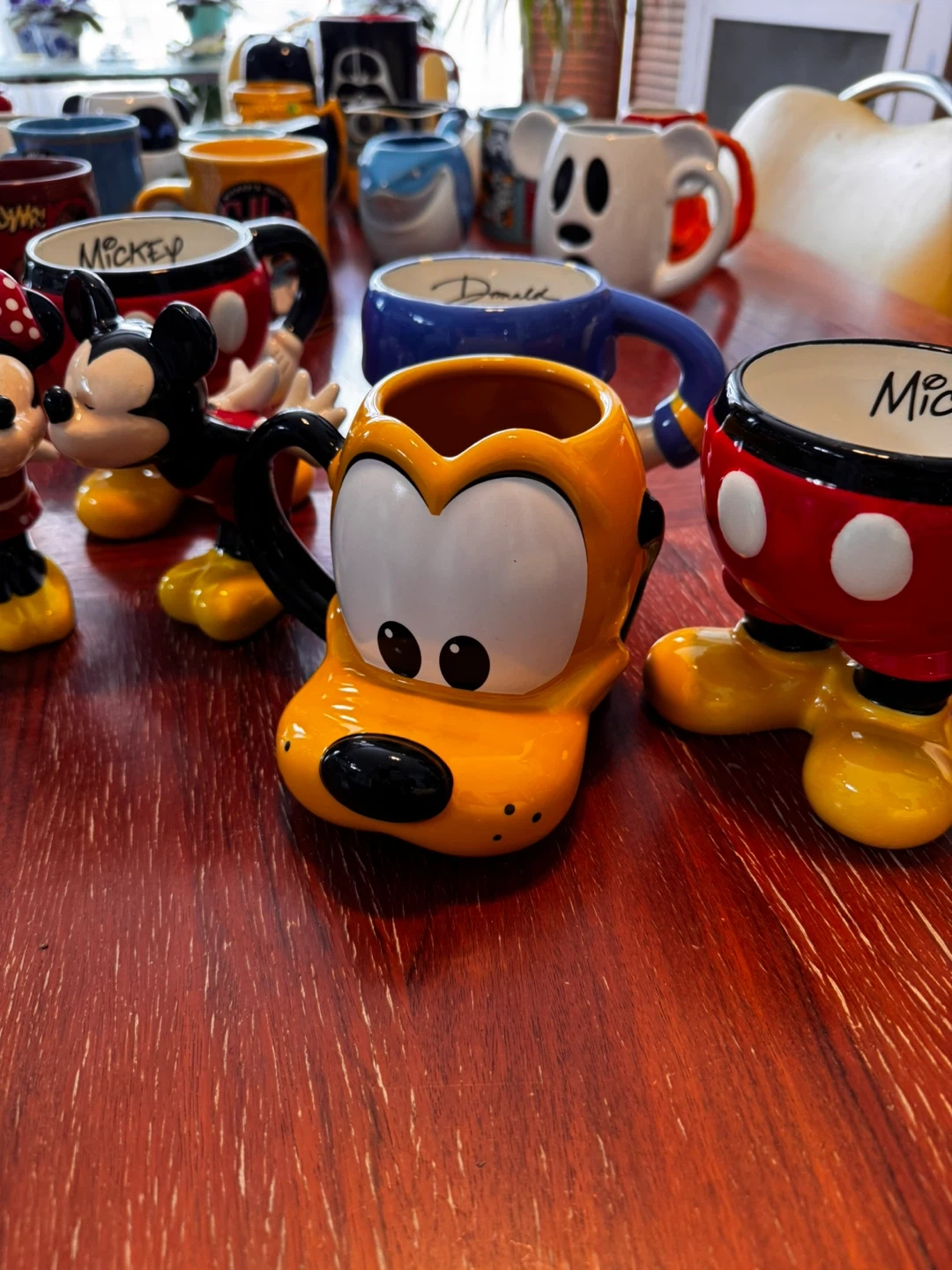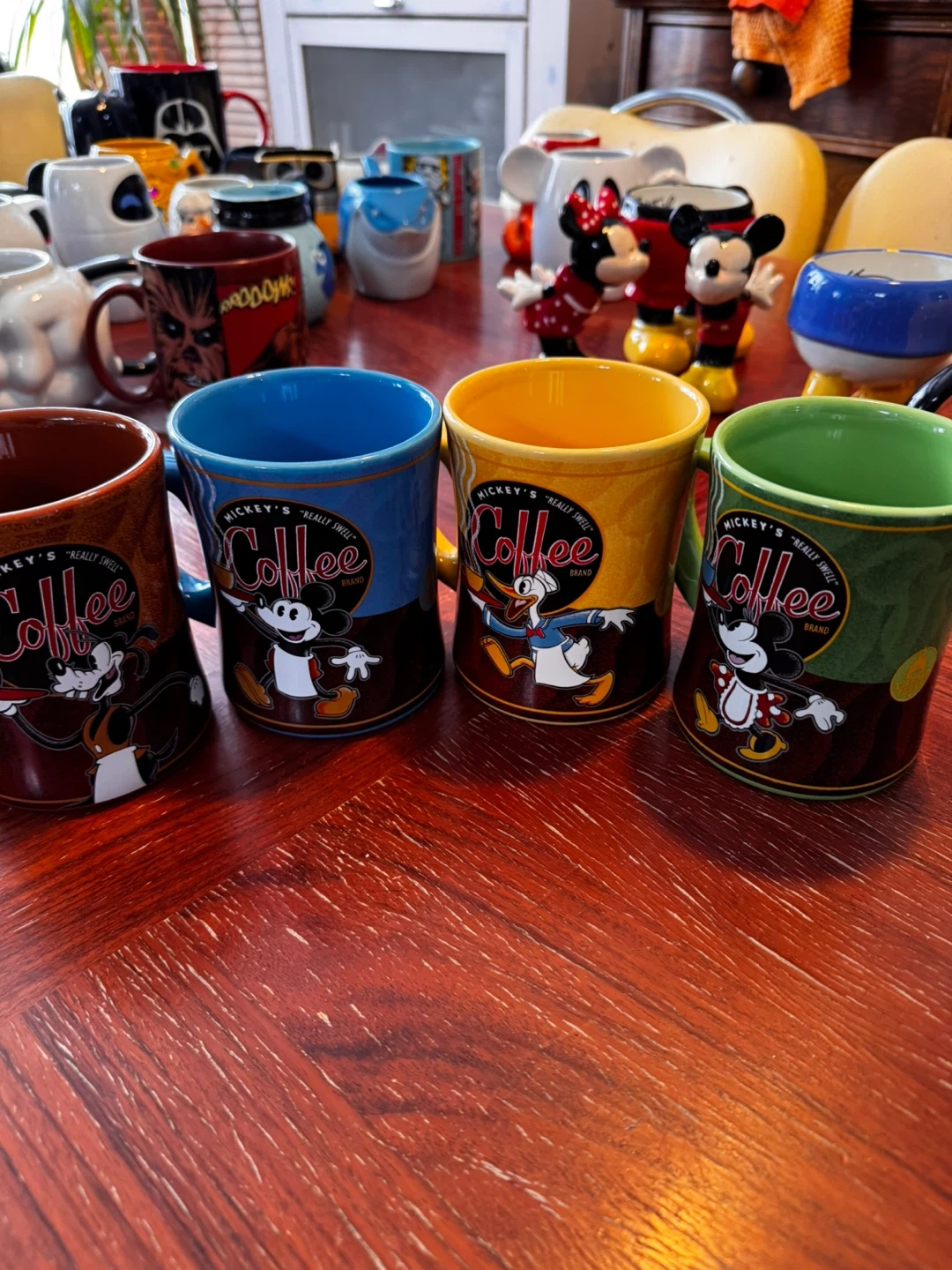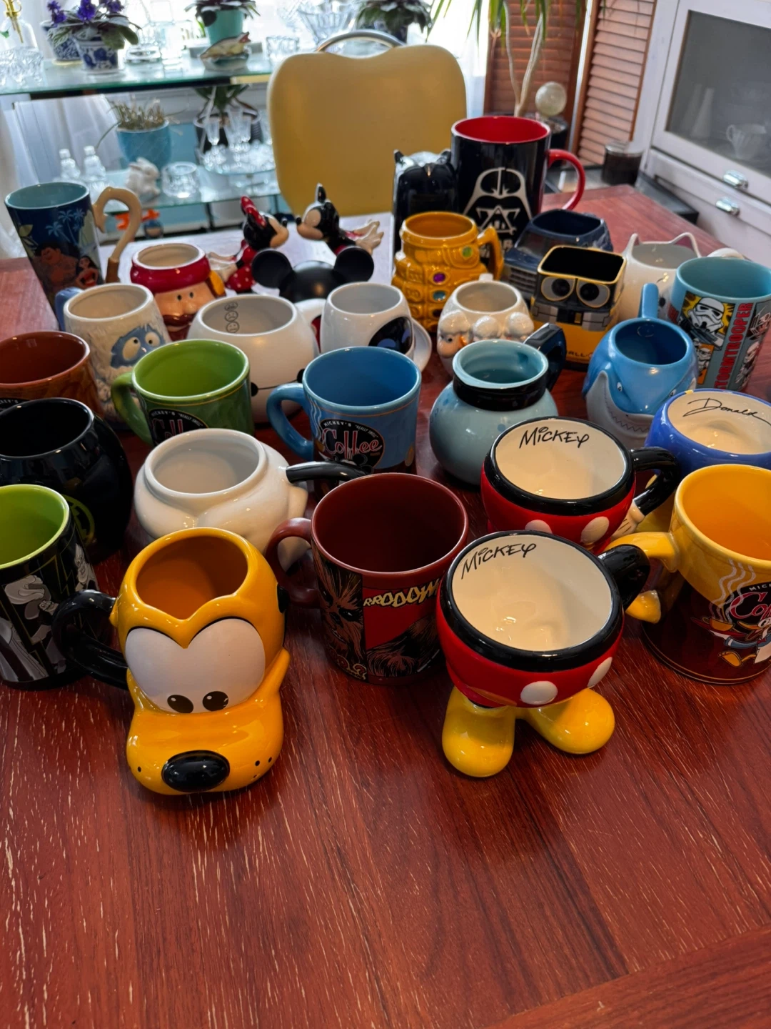 Collection of fun Star Wars and Disney character mugs. Includes Darth Vader, Stormtroopers, Mickey Mouse, Pluto, and more. Ceramic material.
