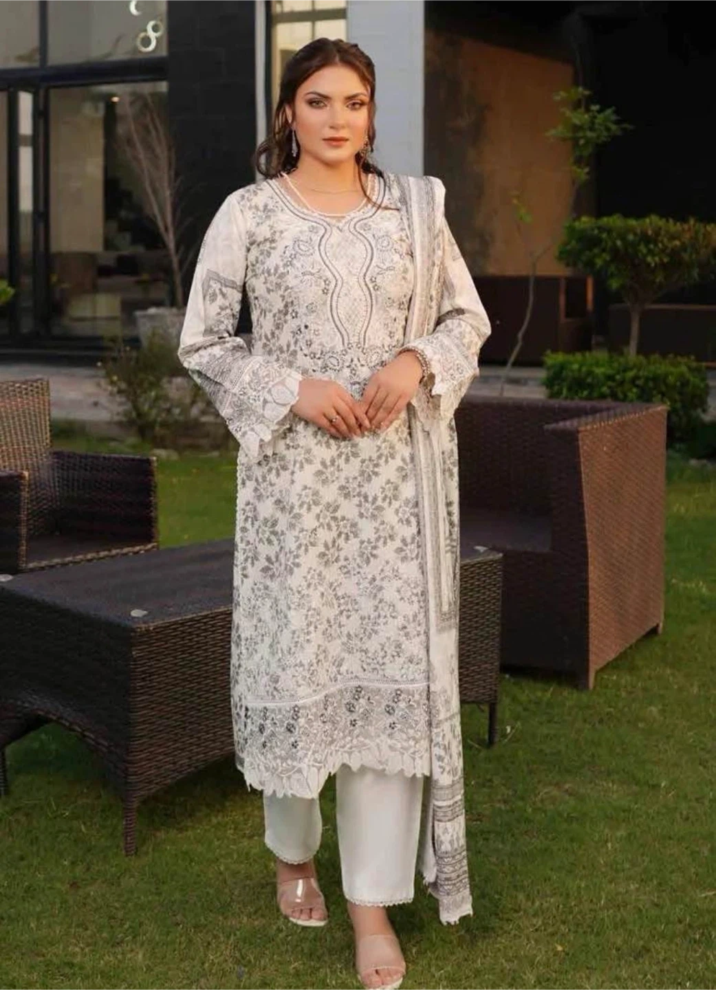 Beautiful white and grey embroidered shalwar kameez. Perfect for a special occasion or everyday wear. The intricate embroidery adds a touch of elegance. The material feels soft and comfortable. This outfit includes a kameez (tunic), shalwar (pants), and dupatta (scarf).