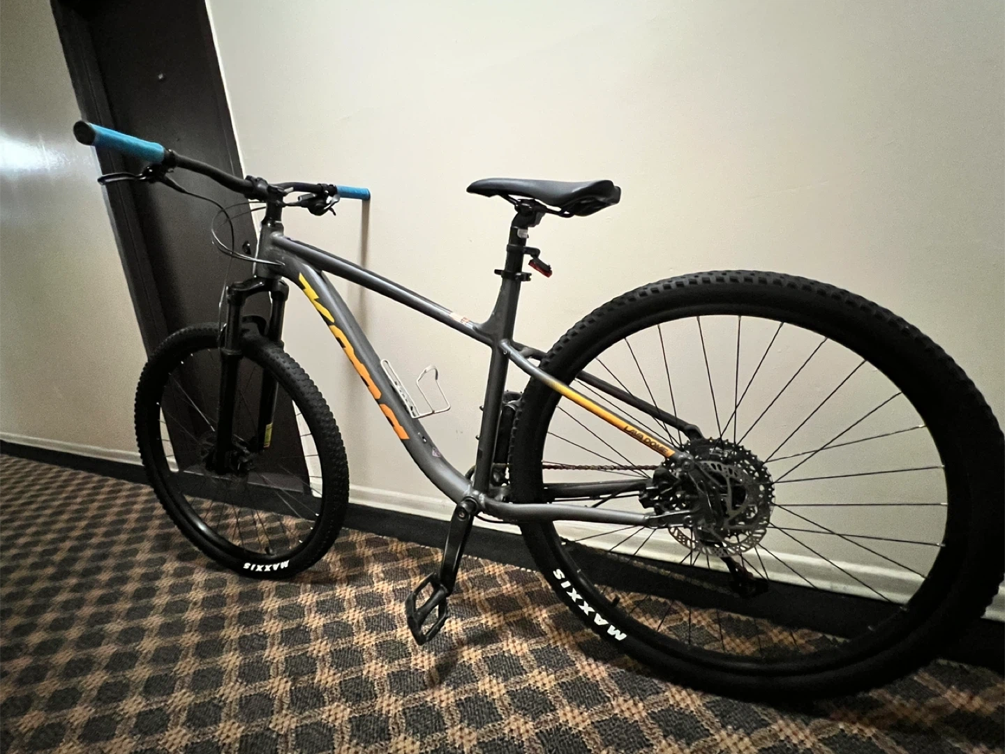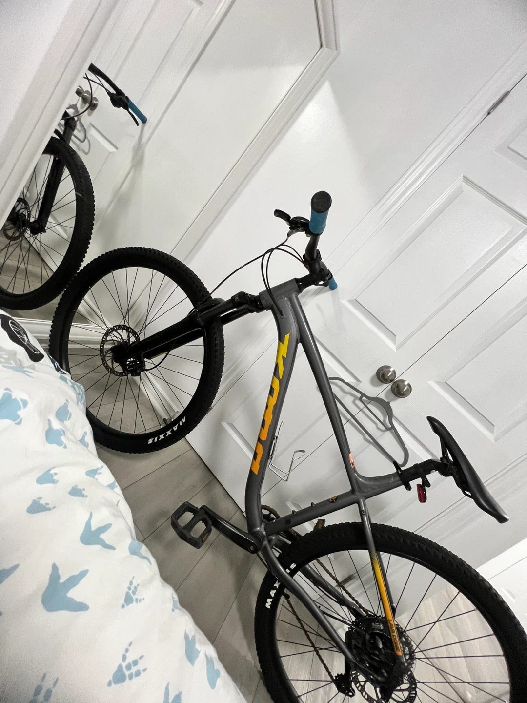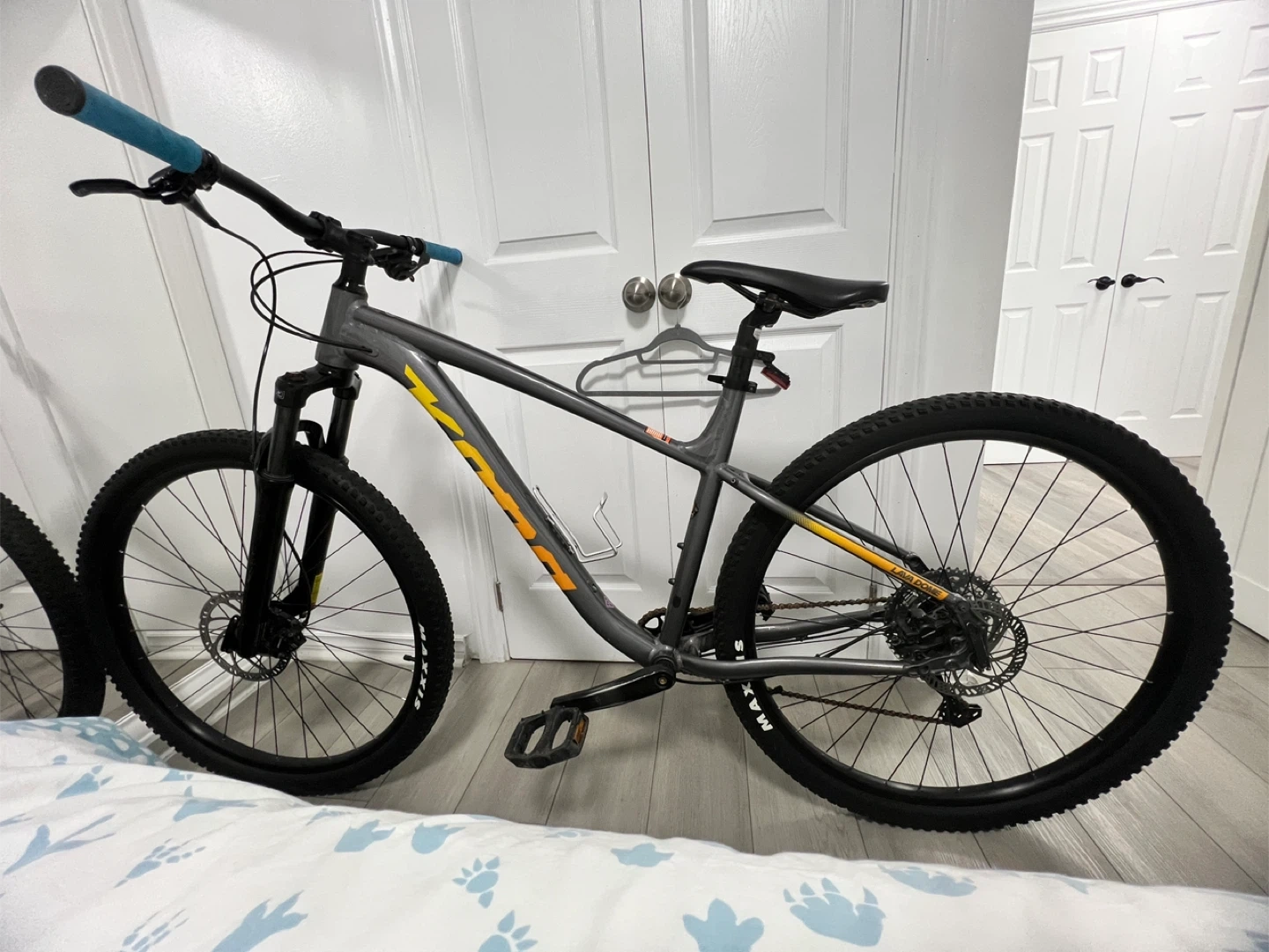 Selling a 29”ers Kona mountain bike in good condition. It's grey with some yellow detailing. The tires are 29’ Maxxis. Perfect for hitting the trails!
