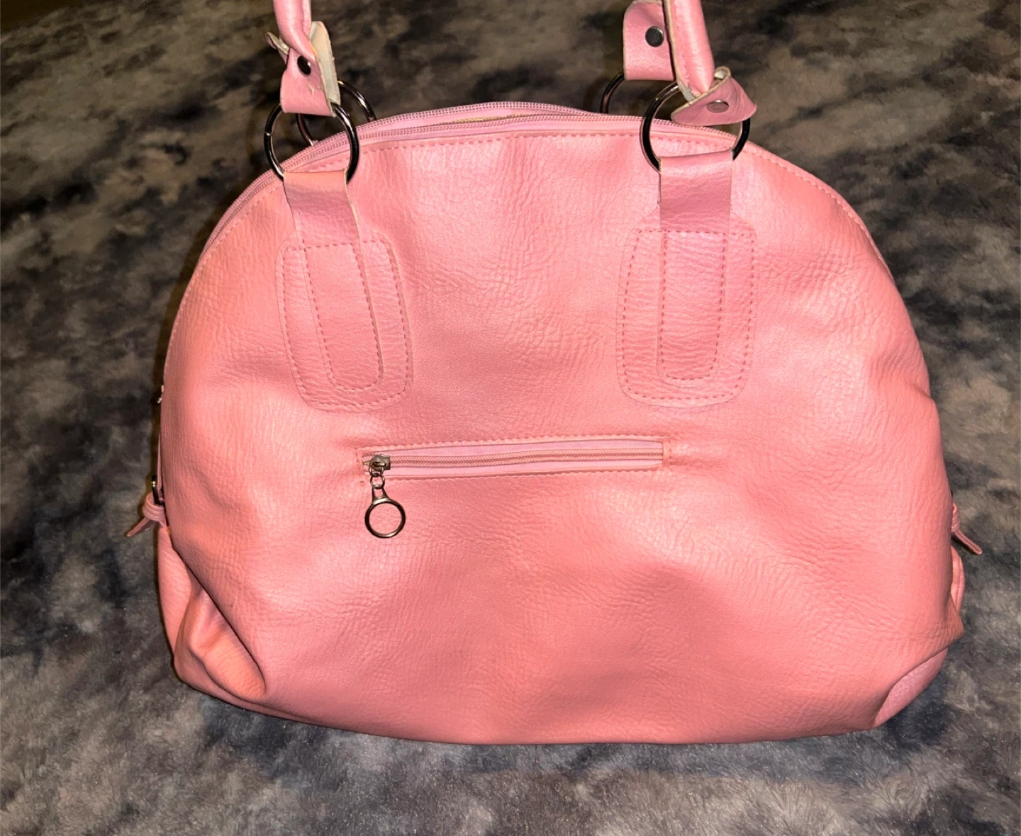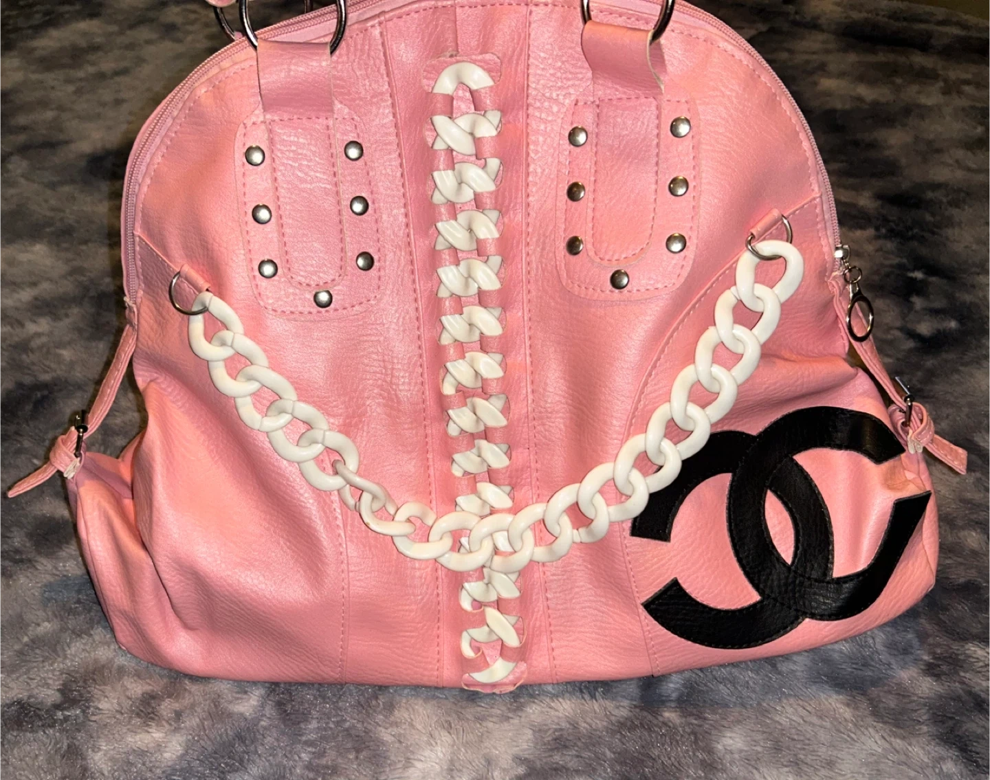 Selling a cute pink handbag with a "Chanel" inspired logo. It's in good condition and has a unique design with white accents and silver hardware. Perfect for adding a pop of colour to your outfit! The front chain is also removable as shown in photos