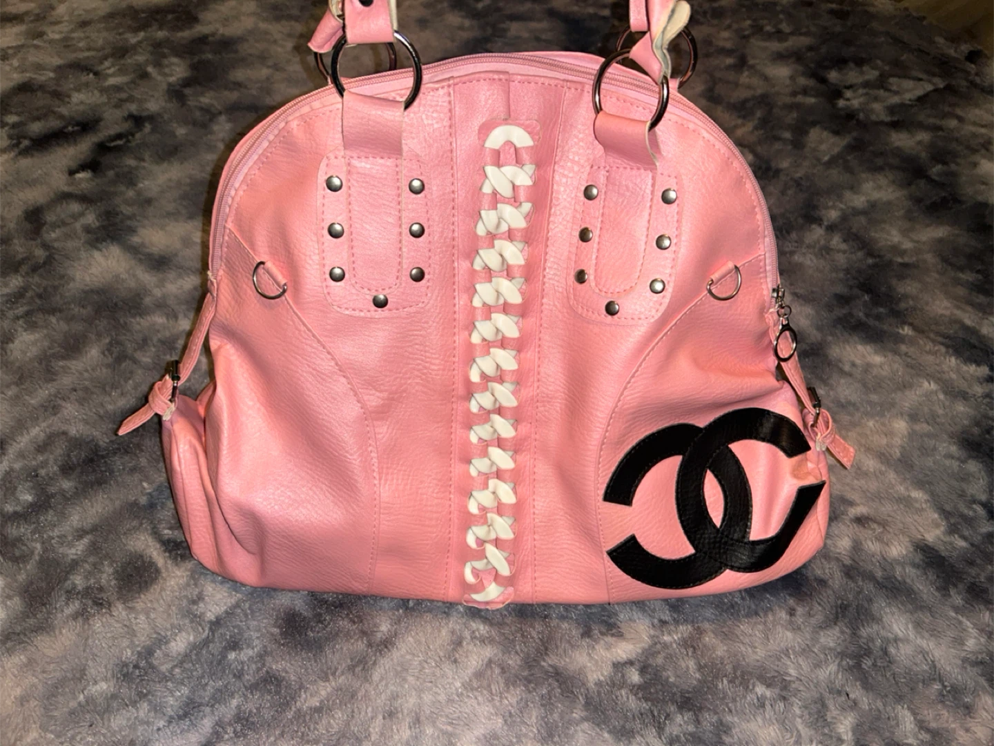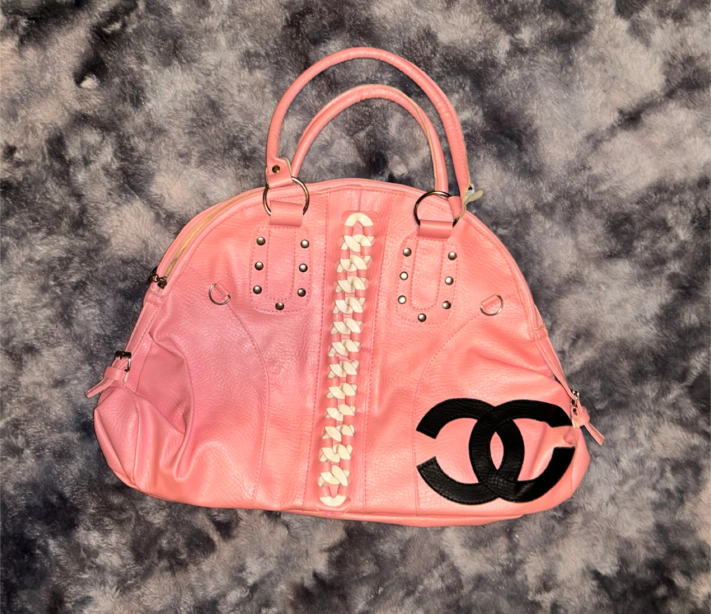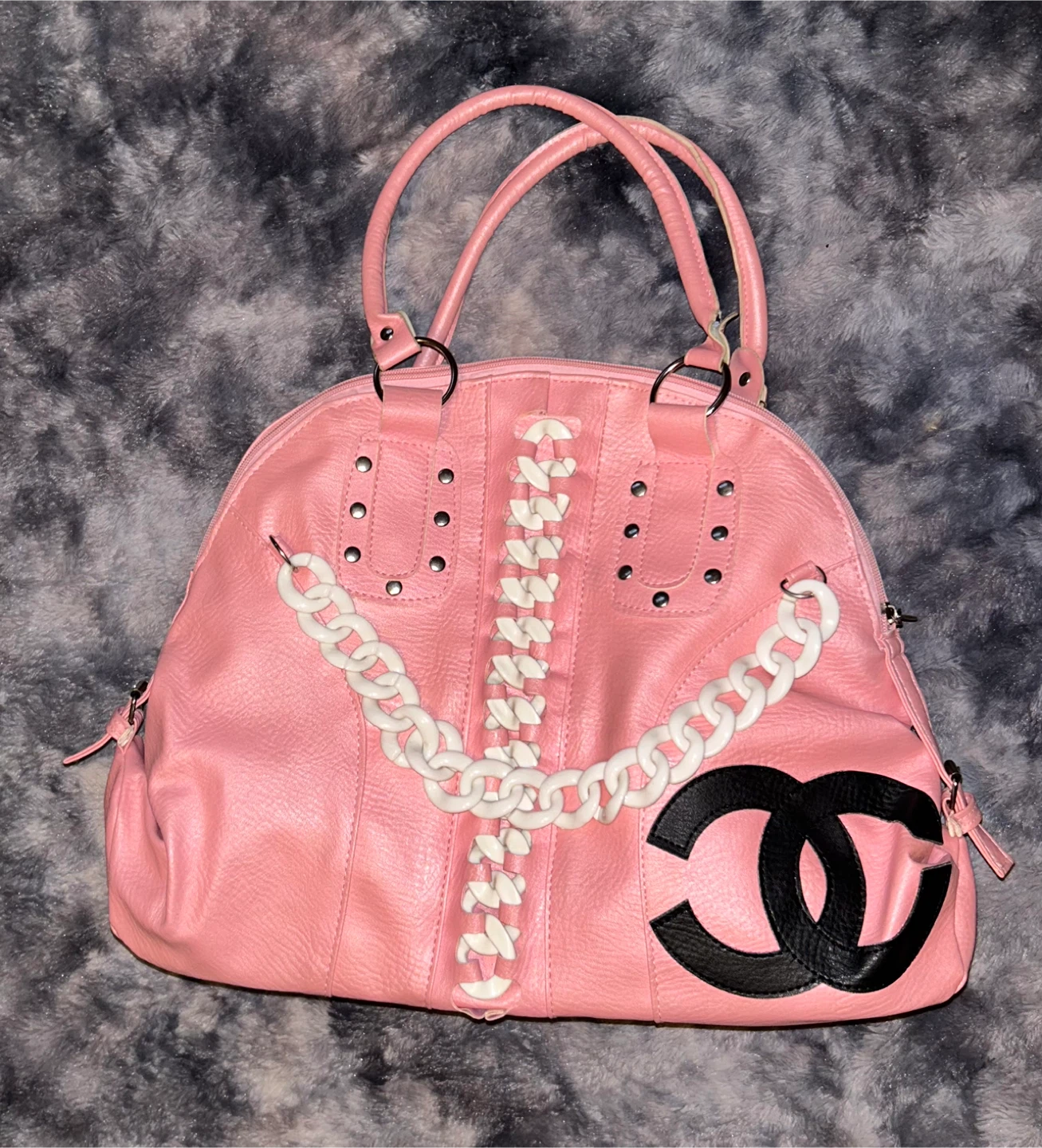 Selling a cute pink handbag with a "Chanel" inspired logo. It's in good condition and has a unique design with white accents and silver hardware. Perfect for adding a pop of colour to your outfit! The front chain is also removable as shown in photos
