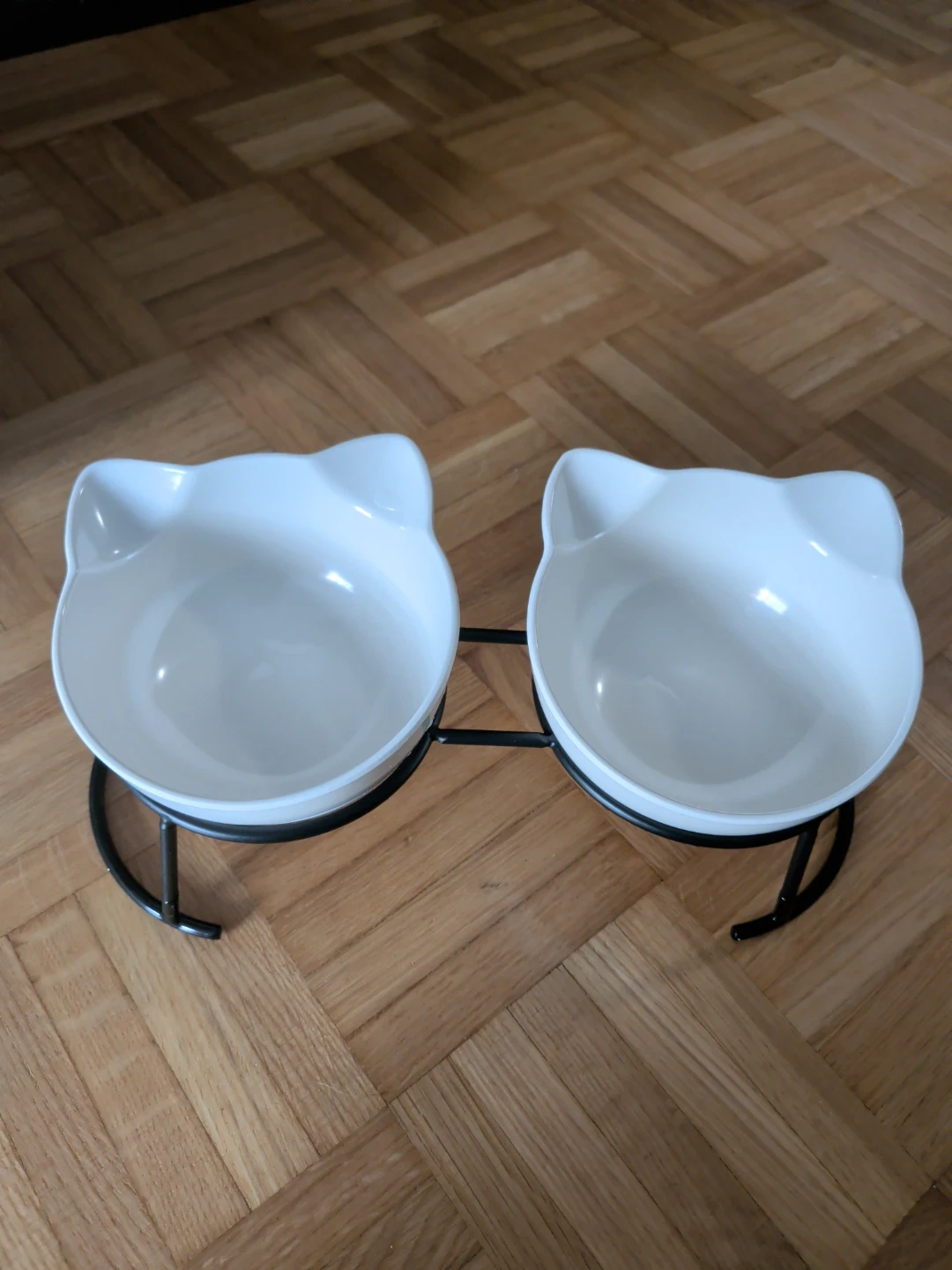 Two white plastic pet bowls shaped like cat faces. They come with a black metal stand to elevate them. Perfect for feeding your cat or small dog.