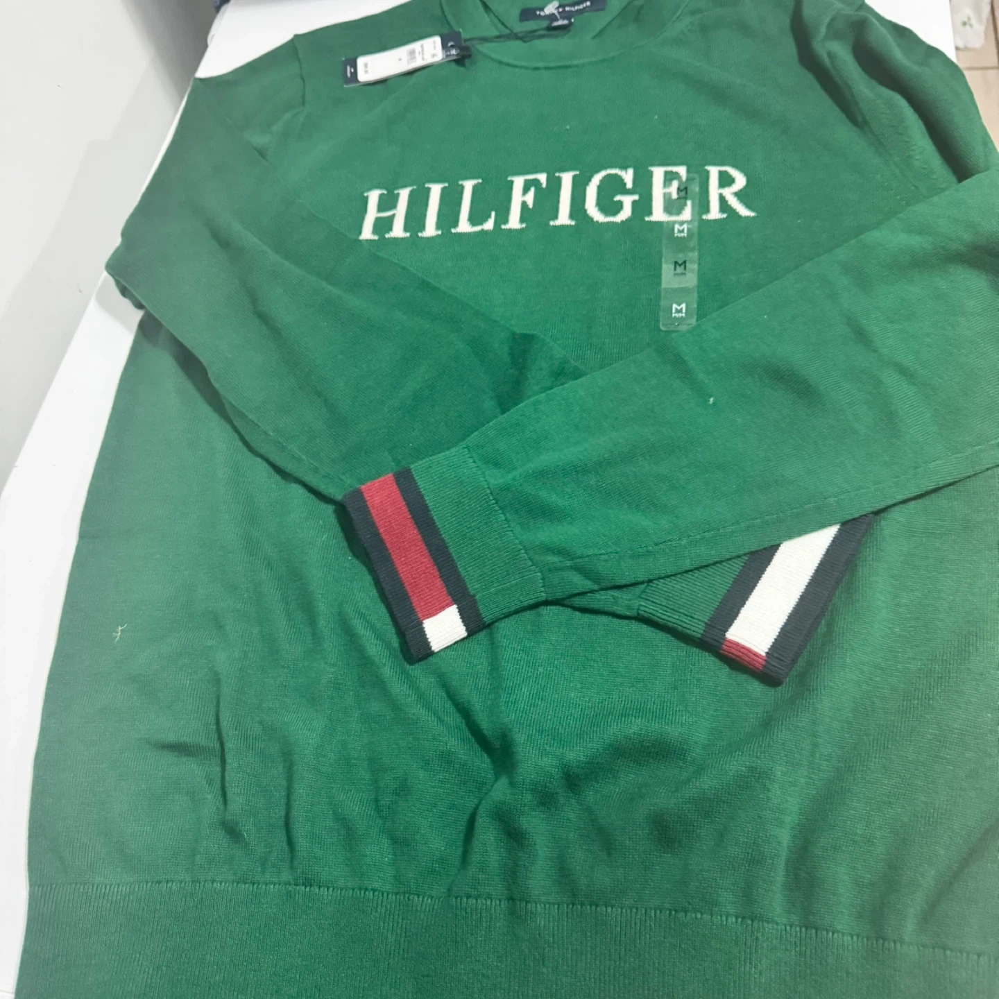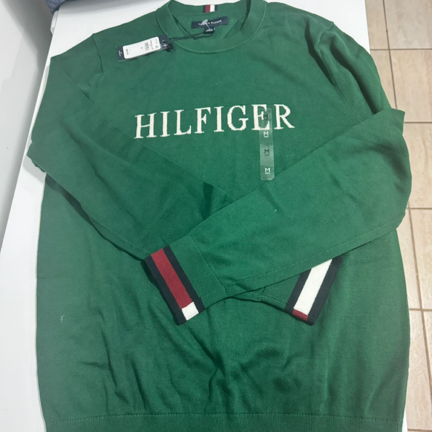 Tommy Hilfiger crew neck sweater in green with large "HILFIGER" graphic across the chest. It features ribbed cuffs with red, white, and blue stripes. Size medium.