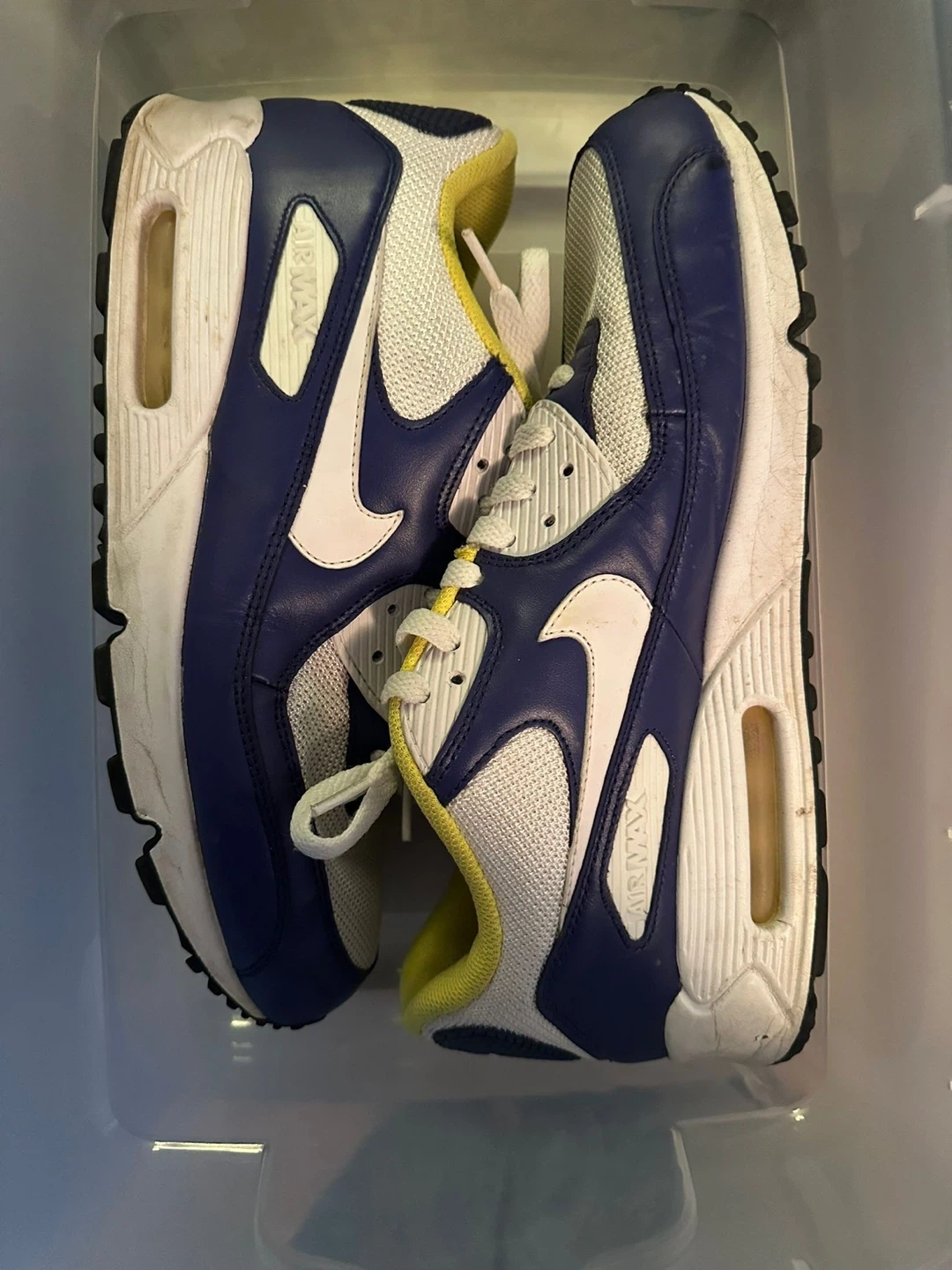 These are Nike Air Max 90 sneakers in a blue, white, and yellow colourway. They're made with a mix of leather and mesh. These shoes are great for everyday wear.