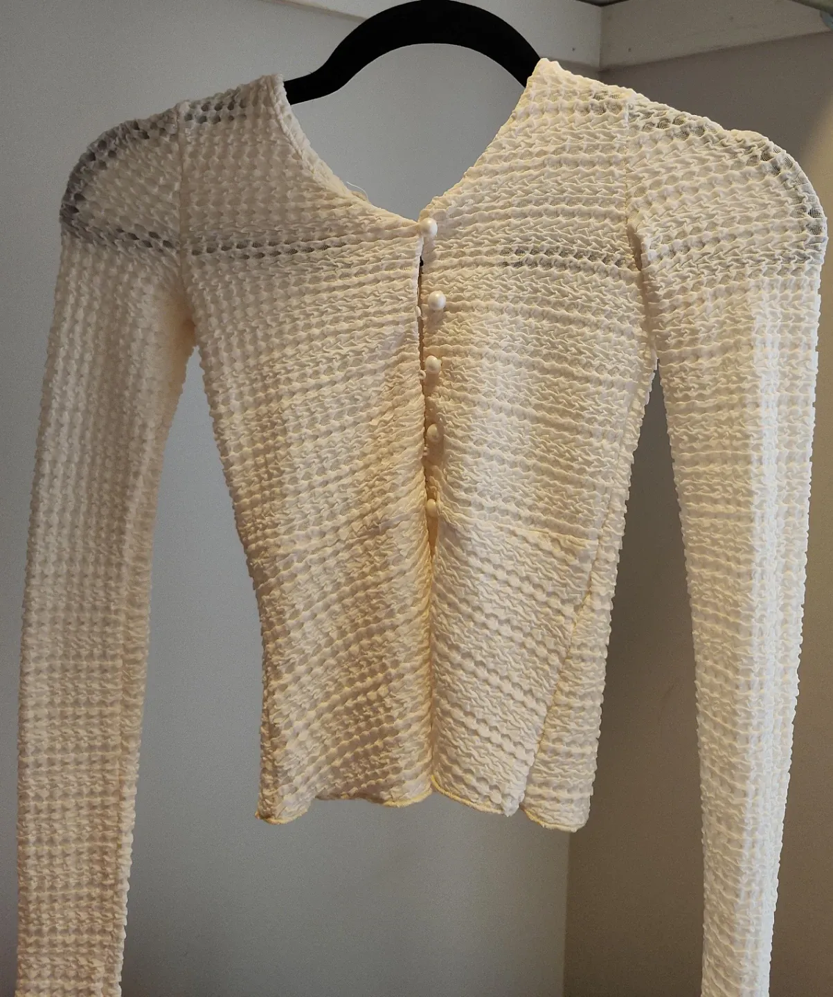 This cream textured long sleeve top features a V-neck and button-up front. It has a unique crinkled fabric with gathered details on the shoulders and sleeves.