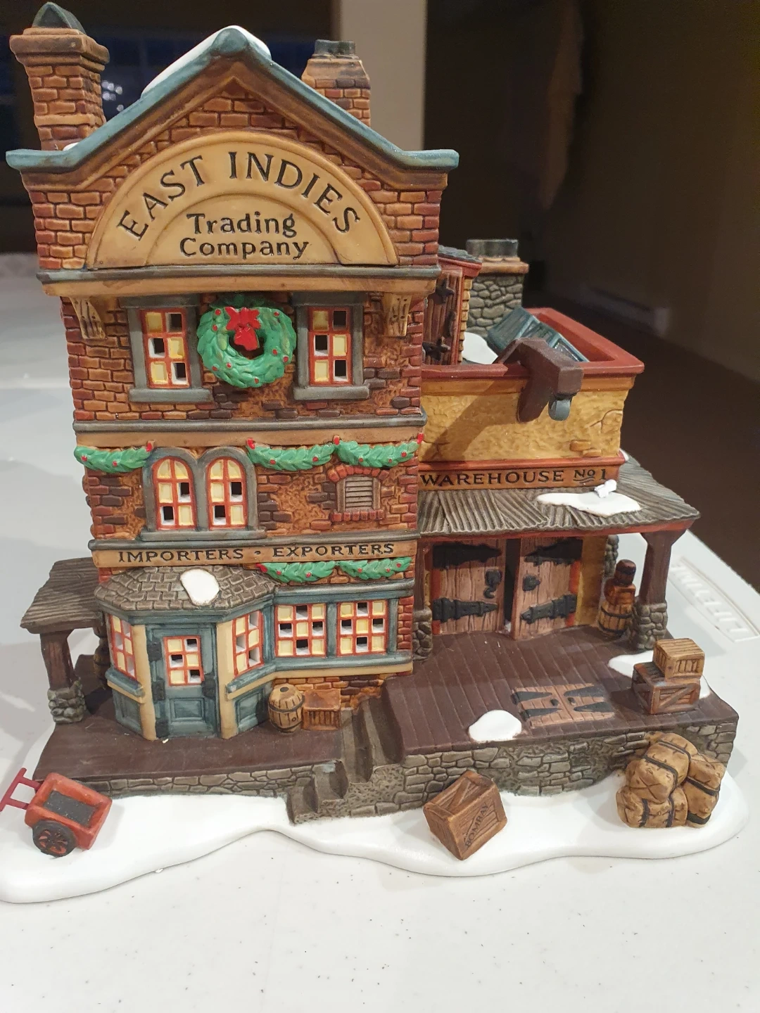 East Indies Trading Company village display piece, featuring a detailed building with a festive wreath and snow accents. A charming addition to your holiday decorations!