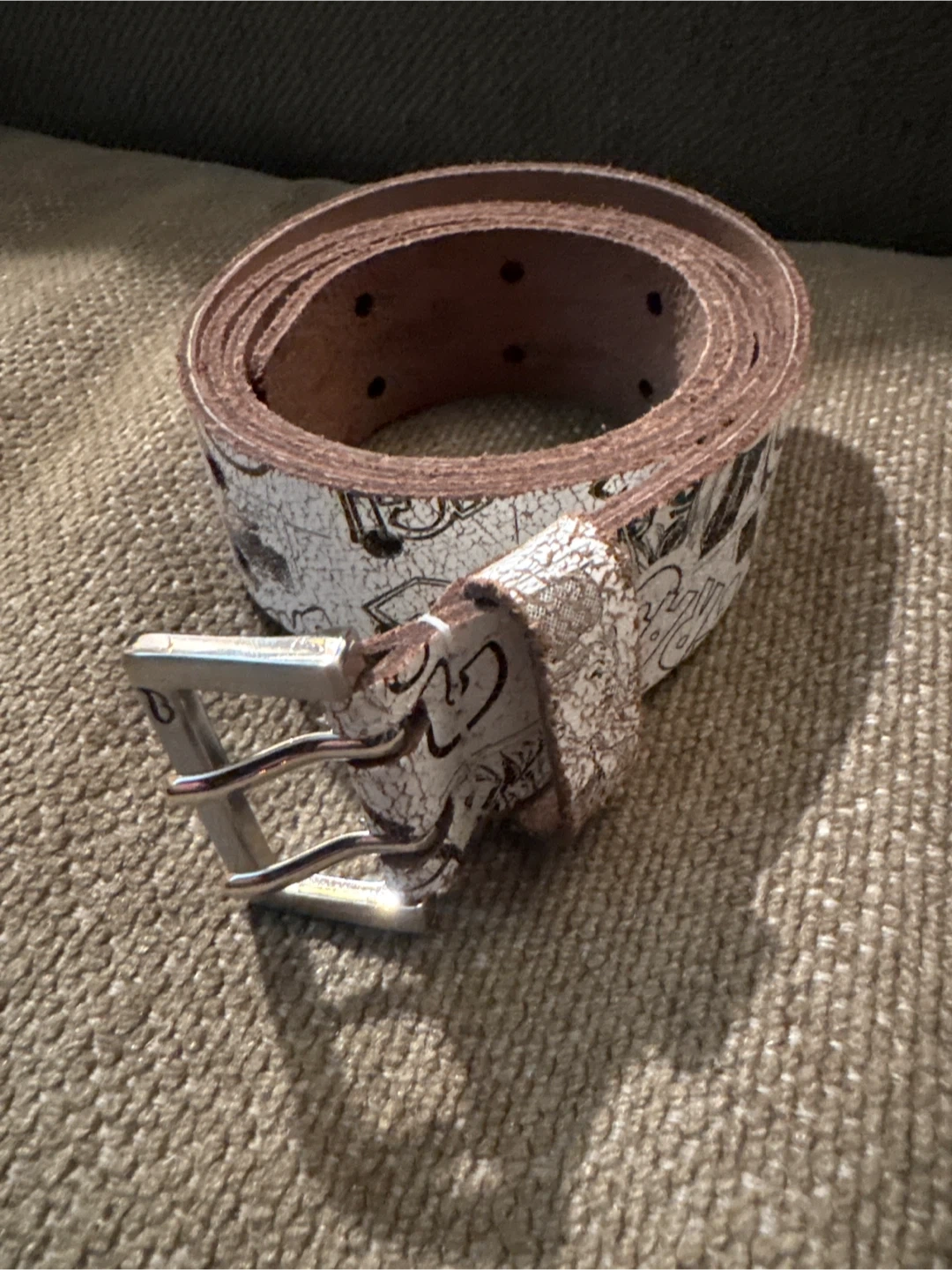 Selling a Buffalo brand belt made of genuine leather. It's a size L/L and features a unique comic book style design. The belt shows some signs of wear, but is still in good condition and ready to be worn!