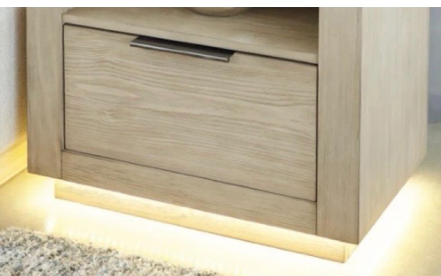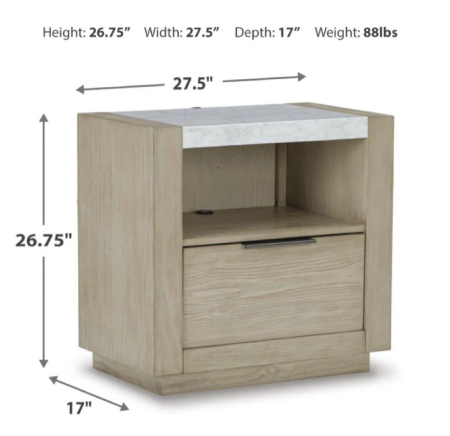 A nightstand with a wood finish and a marble top. It measures 26.75" high, 27.5" wide, and 17" deep. It has one drawer and an open shelf with integrated lighting at the base.
