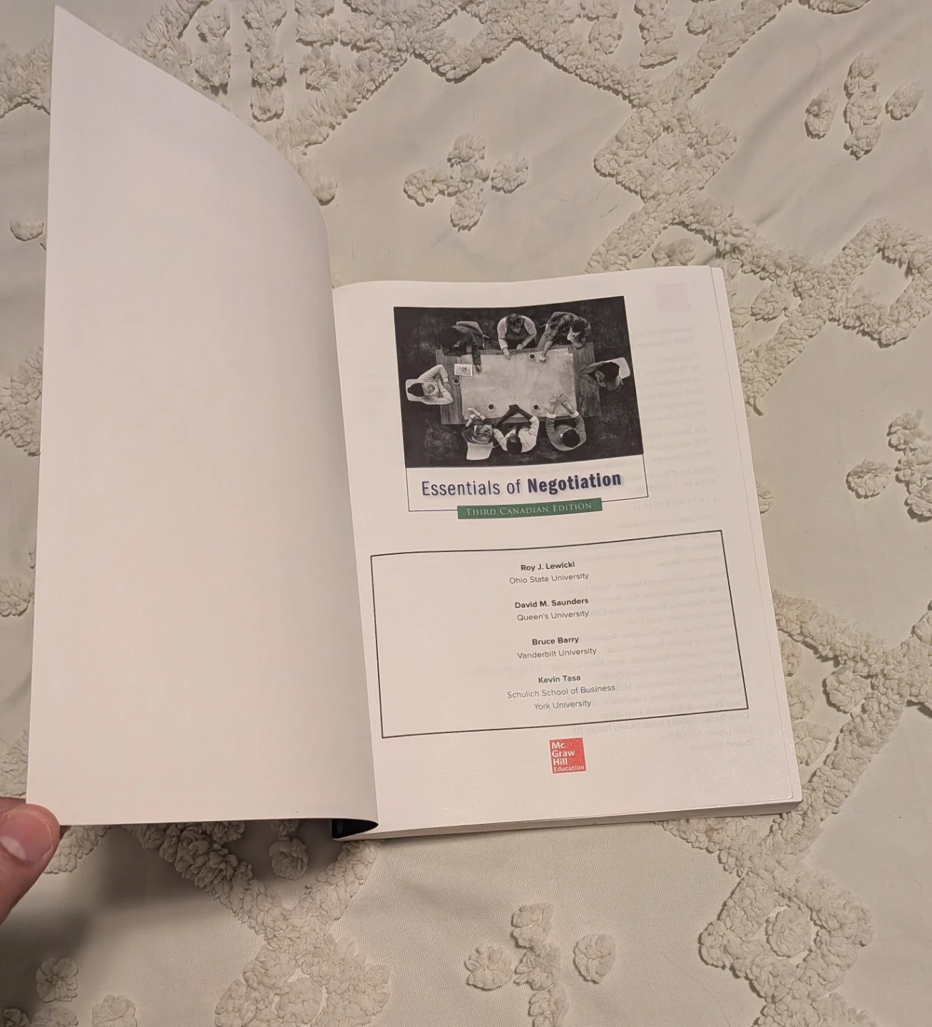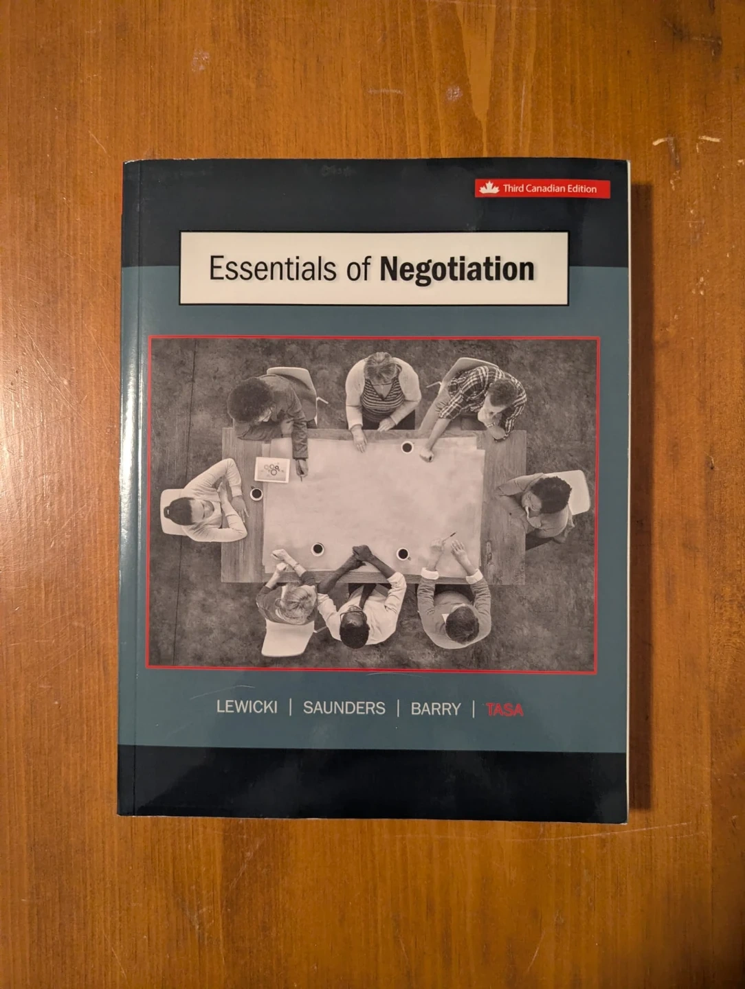 This textbook covers the essentials of negotiation. It's the Third Canadian Edition. Authors include Lewicki, Saunders, Barry, and Tasa.