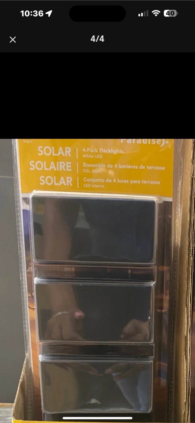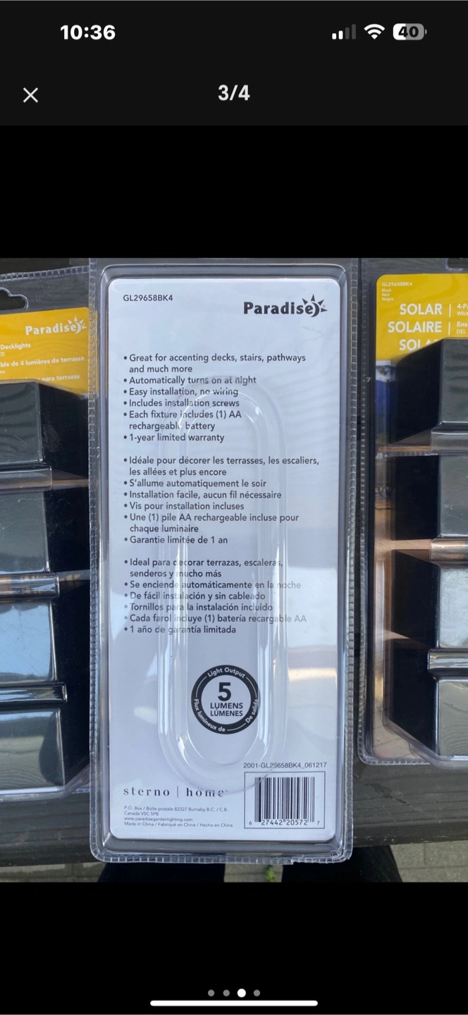 Four-pack solar deck lights. White LED. Easy installation, no wiring needed. Includes one AA rechargeable battery per light. Great for decks, stairs, pathways. I Have 5 packs for $20 each = $100