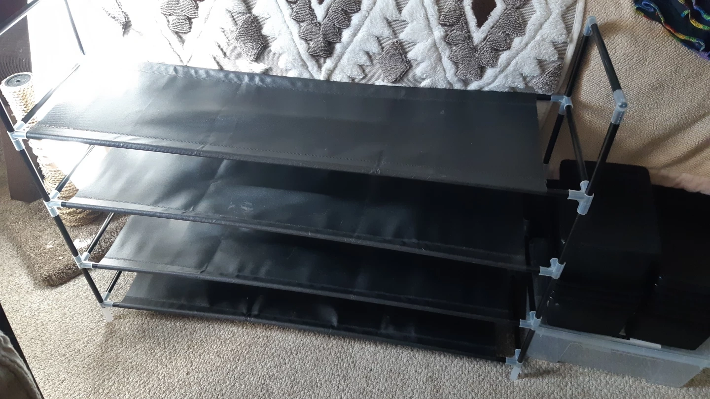 Like new. Holds 16 pr. Adult shoes. Black heavy duty plastic with wipeable fabric shelves. 38.5" wide 29.5" tall and 10.5" deep. Pick up location is close to Calgary Trail and 51 ave