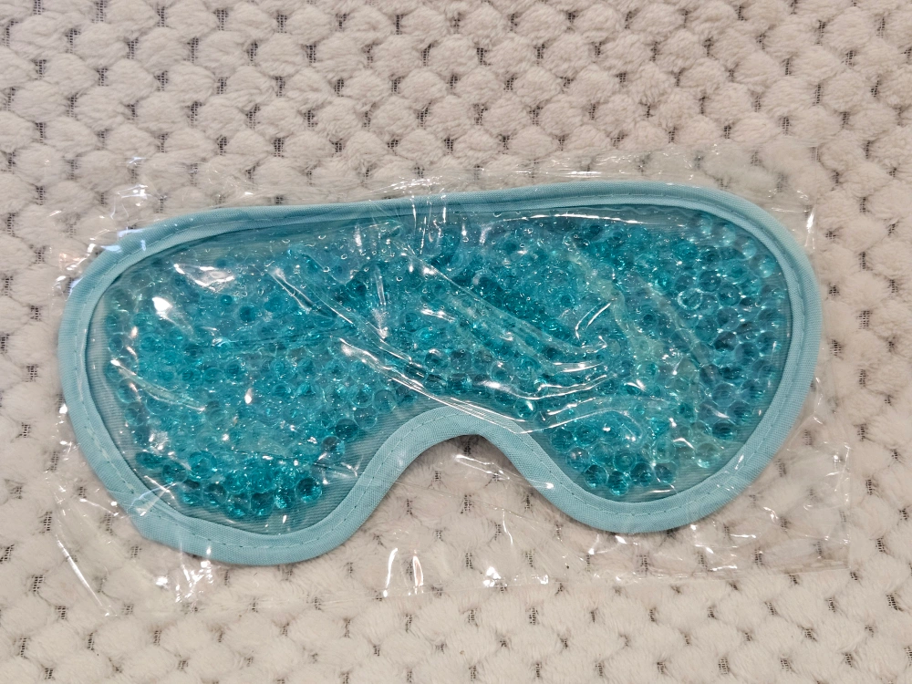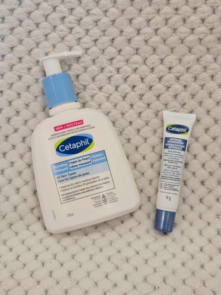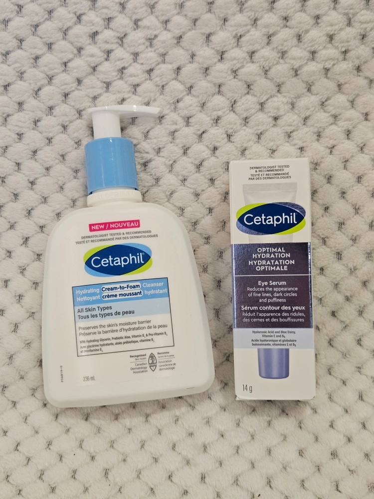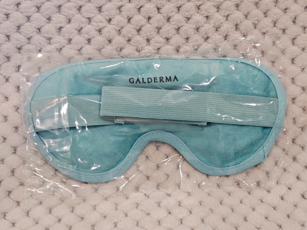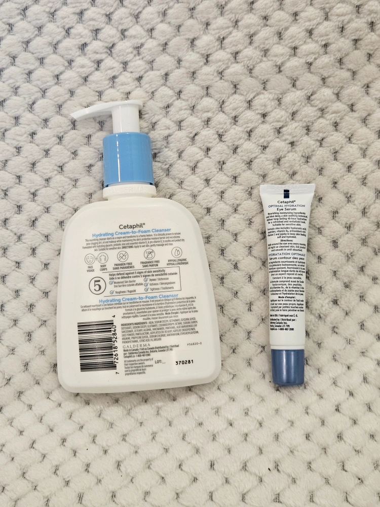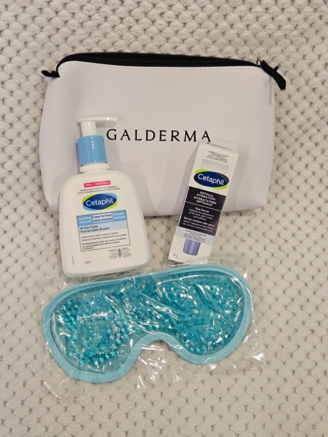 White Galderma cosmetic bag. Includes Cetaphil Hydrating Cream-to-Foam Cleanser and Cetaphil Optimal Hydration Eye Serum. Also features a blue gel eye mask.