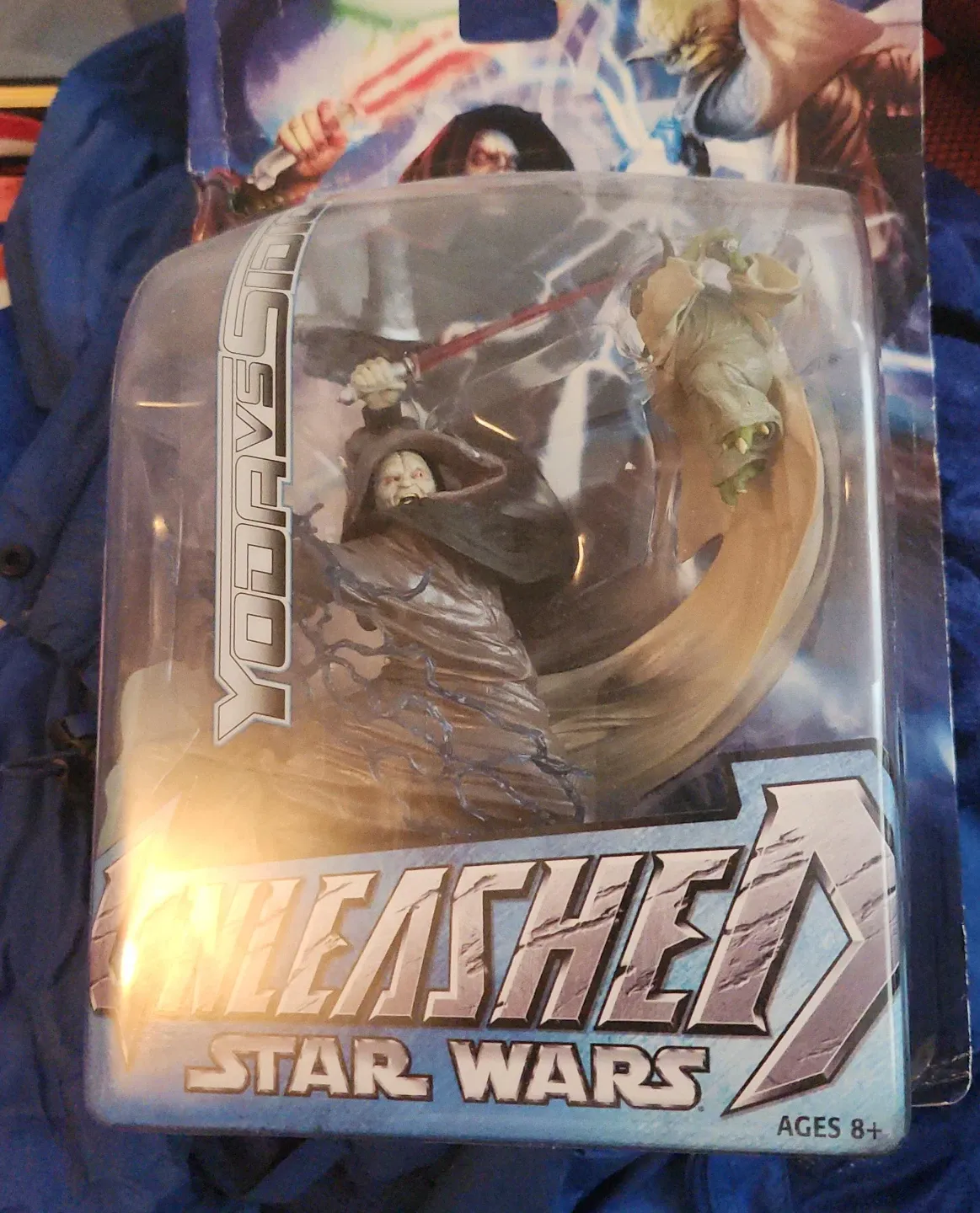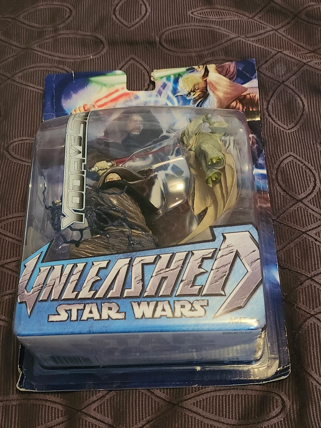 This Star Wars Unleashed action figure set features Yoda in a battle pose against a Sith Lord. It's from the Unleashed line, depicting characters in dynamic action. Recommended for ages 8 and up.