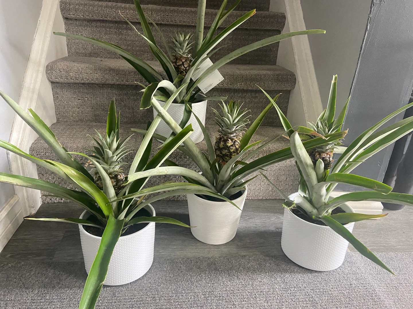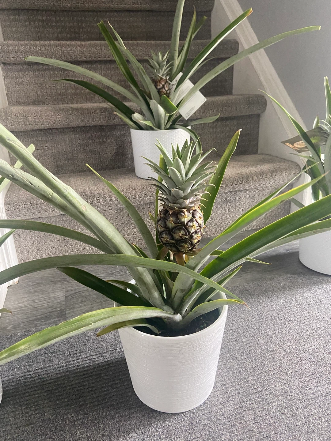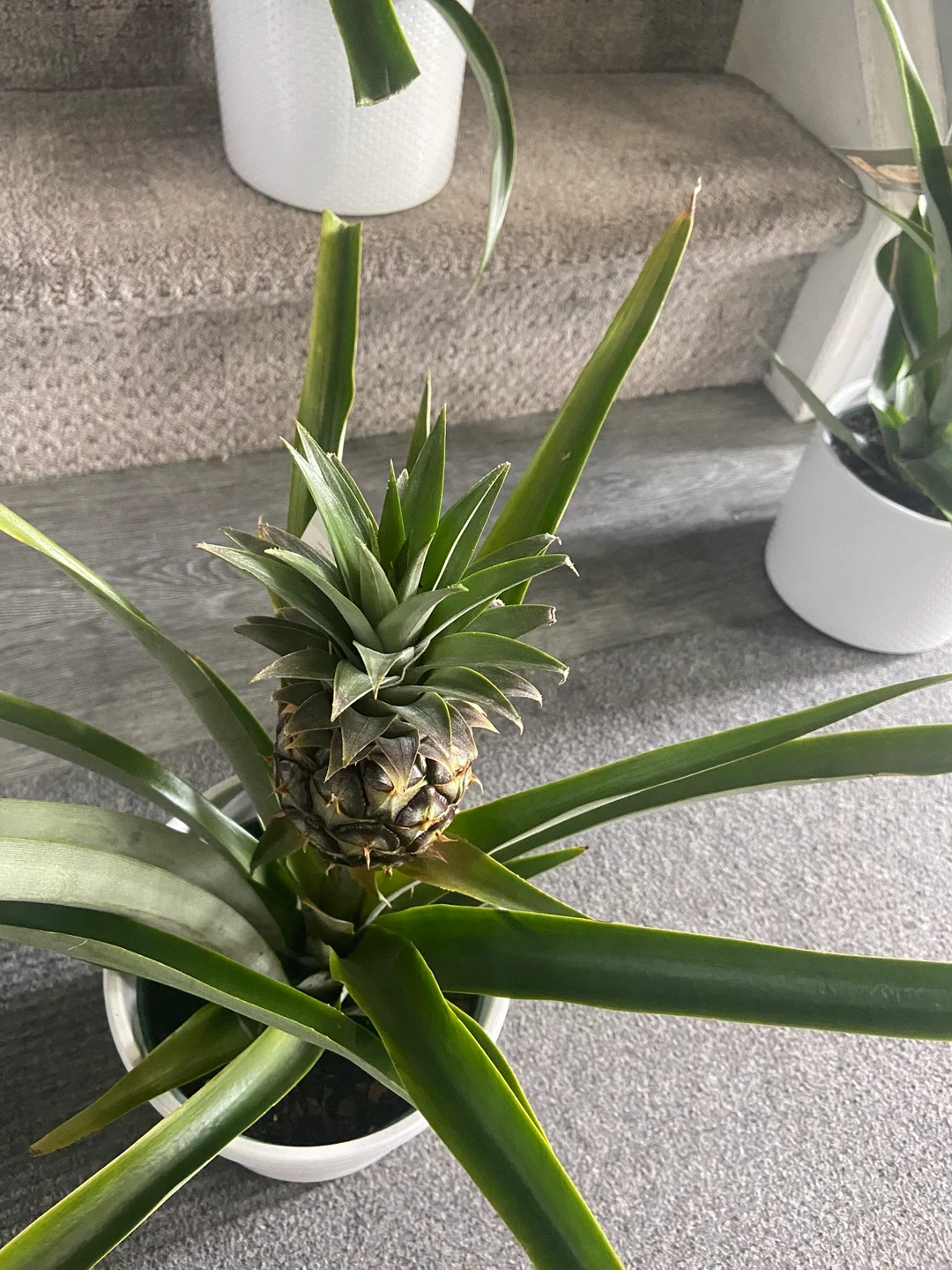 A vibrant potted pineapple plant, complete with a developing fruit! It's planted in a stylish white textured pot. These make a unique addition to any home or garden space.