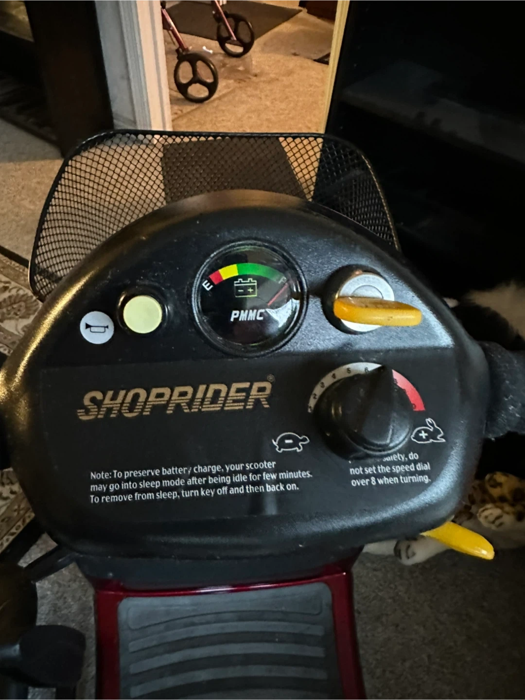Shoprider portable scooter in good condition. It has a battery charge indicator and a front basket for storage. Its seat is adjustable for comfort.