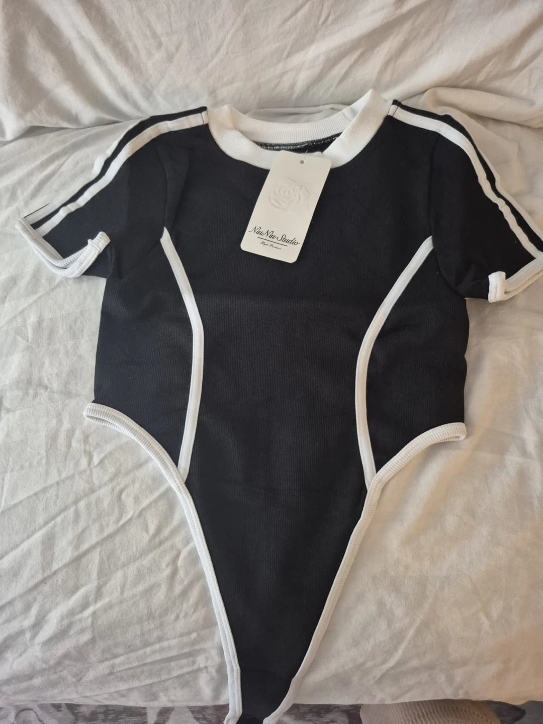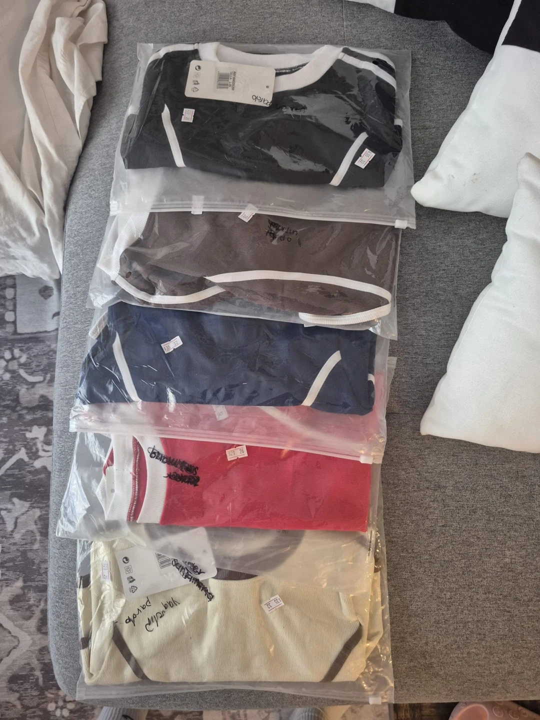 Pack of 5 bodysuits Includes black, brown, navy, red, and cream colours. Ribbed material with contrast piping and white trim. Short sleeves.