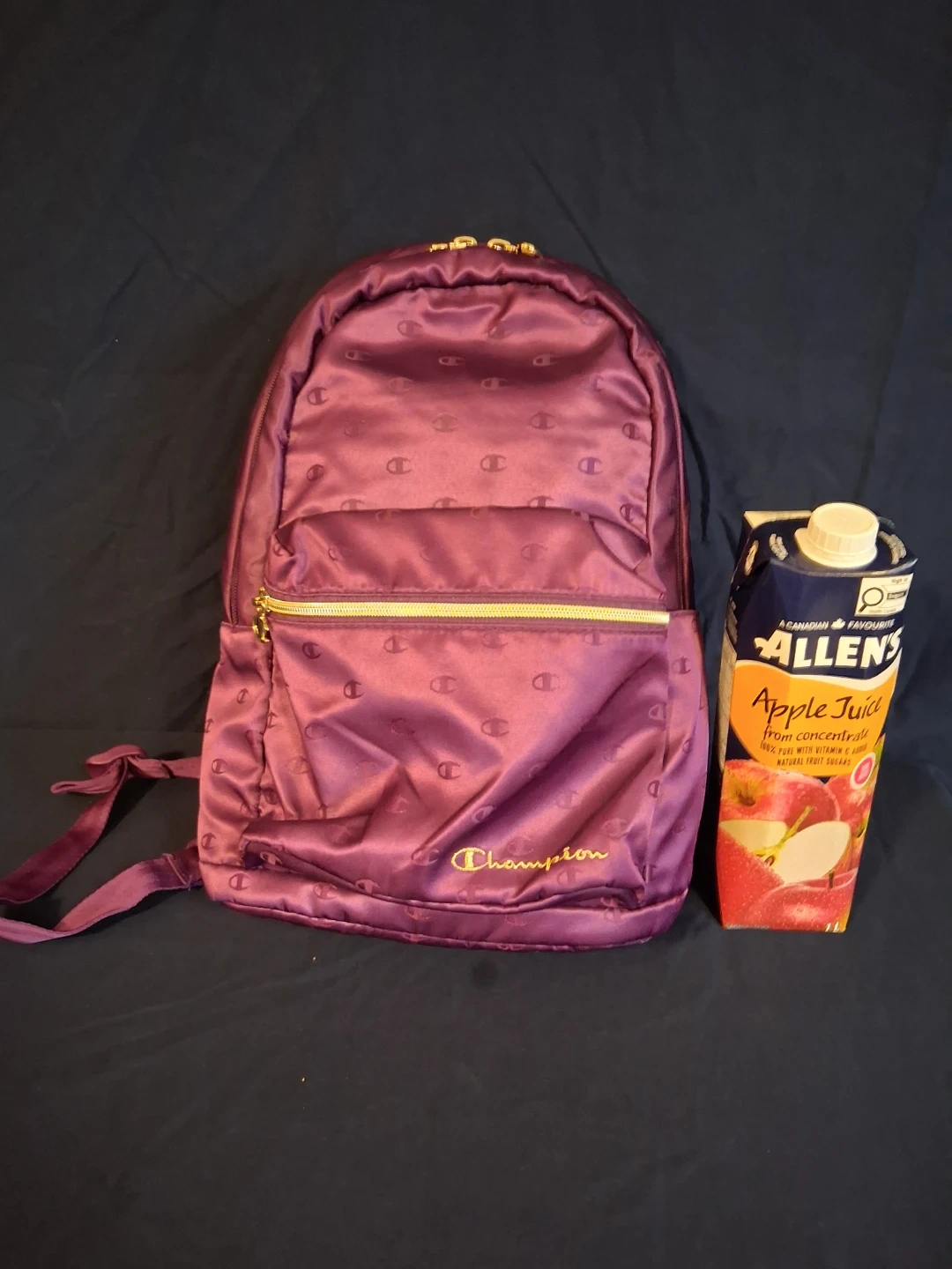 This Champion backpack is a stylish plum colour with the classic 'C' logo pattern all over. It has a main zippered compartment and a front zippered pocket. The material appears to be satin.
