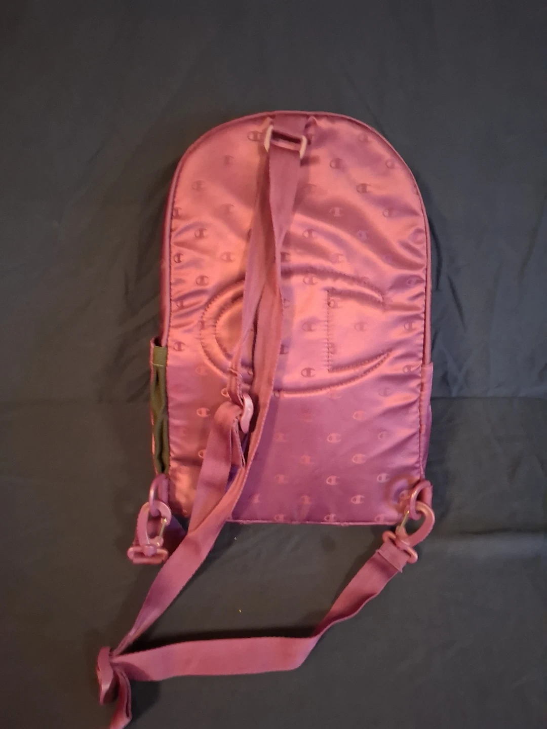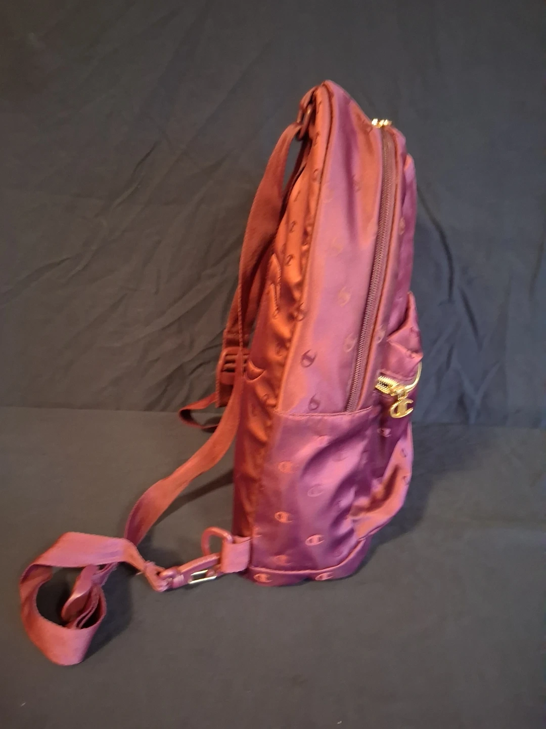 This Champion backpack is a stylish plum colour with the classic 'C' logo pattern all over. It has a main zippered compartment and a front zippered pocket. The material appears to be satin.