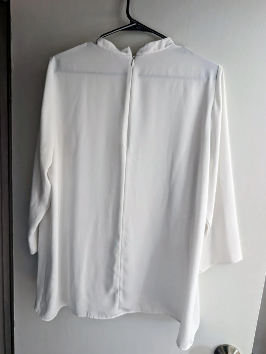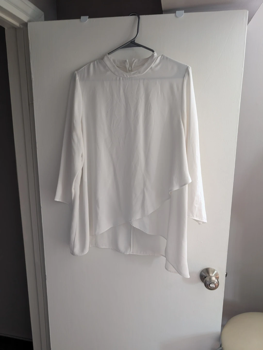 A flowy white blouse with an asymmetrical hemline. It features a high neckline and long sleeves. This top is suitable for many occasions.
