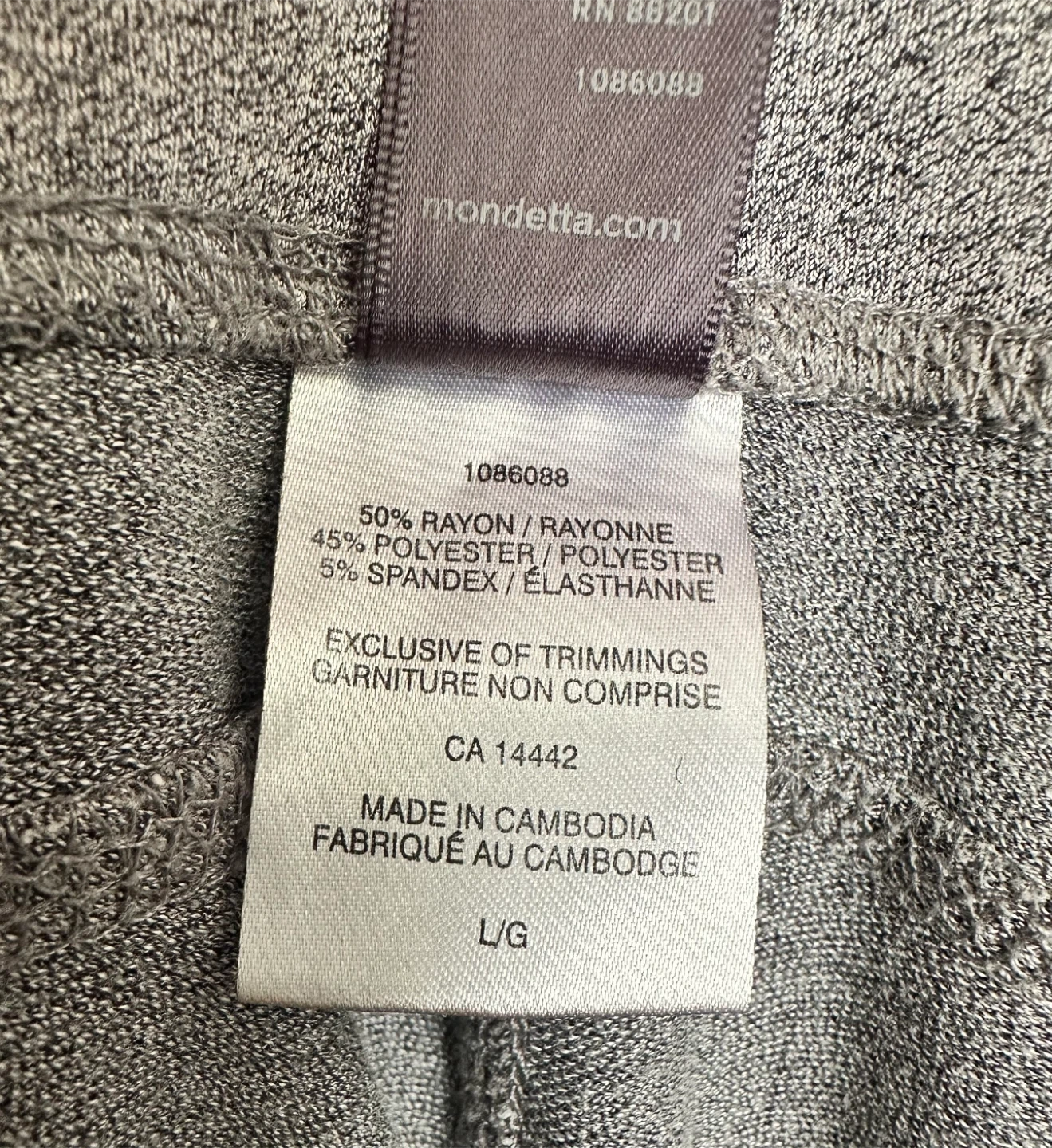 Barely worn Mondetta grey sweatpants. Made with 50% rayon, 45% polyester, and 5% spandex. These pants are size L/G. They're comfortable for lounging or light activity.