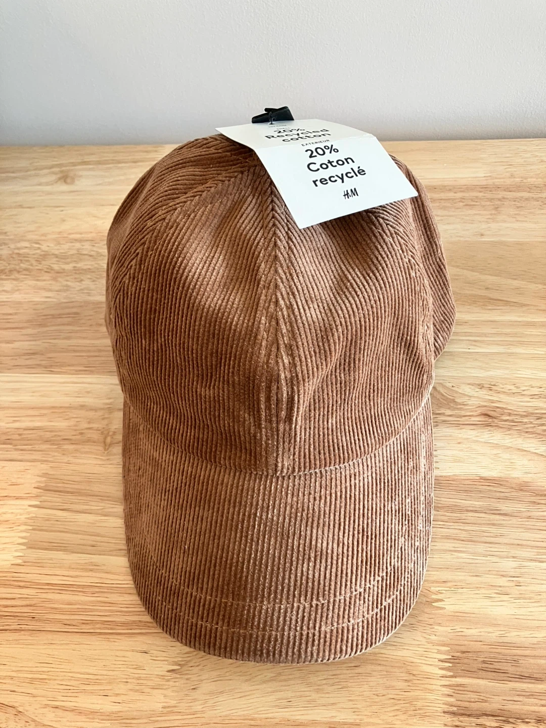 This is an H&M baseball cap. It's made with 20% recycled cotton. This cap offers a classic corduroy look.