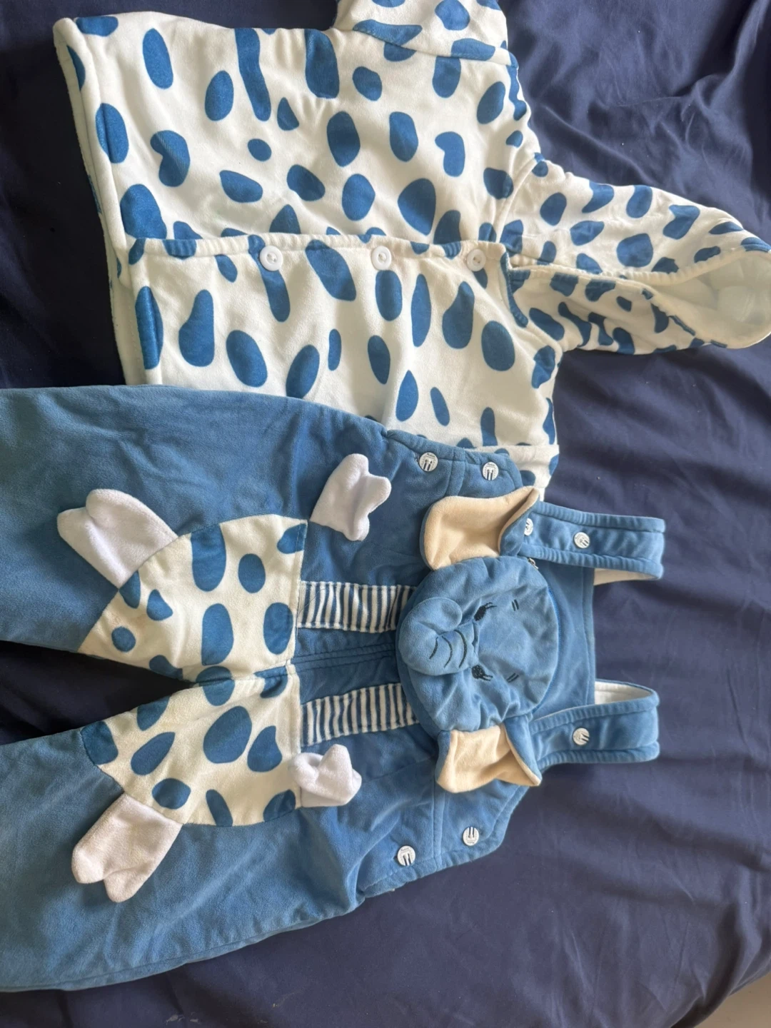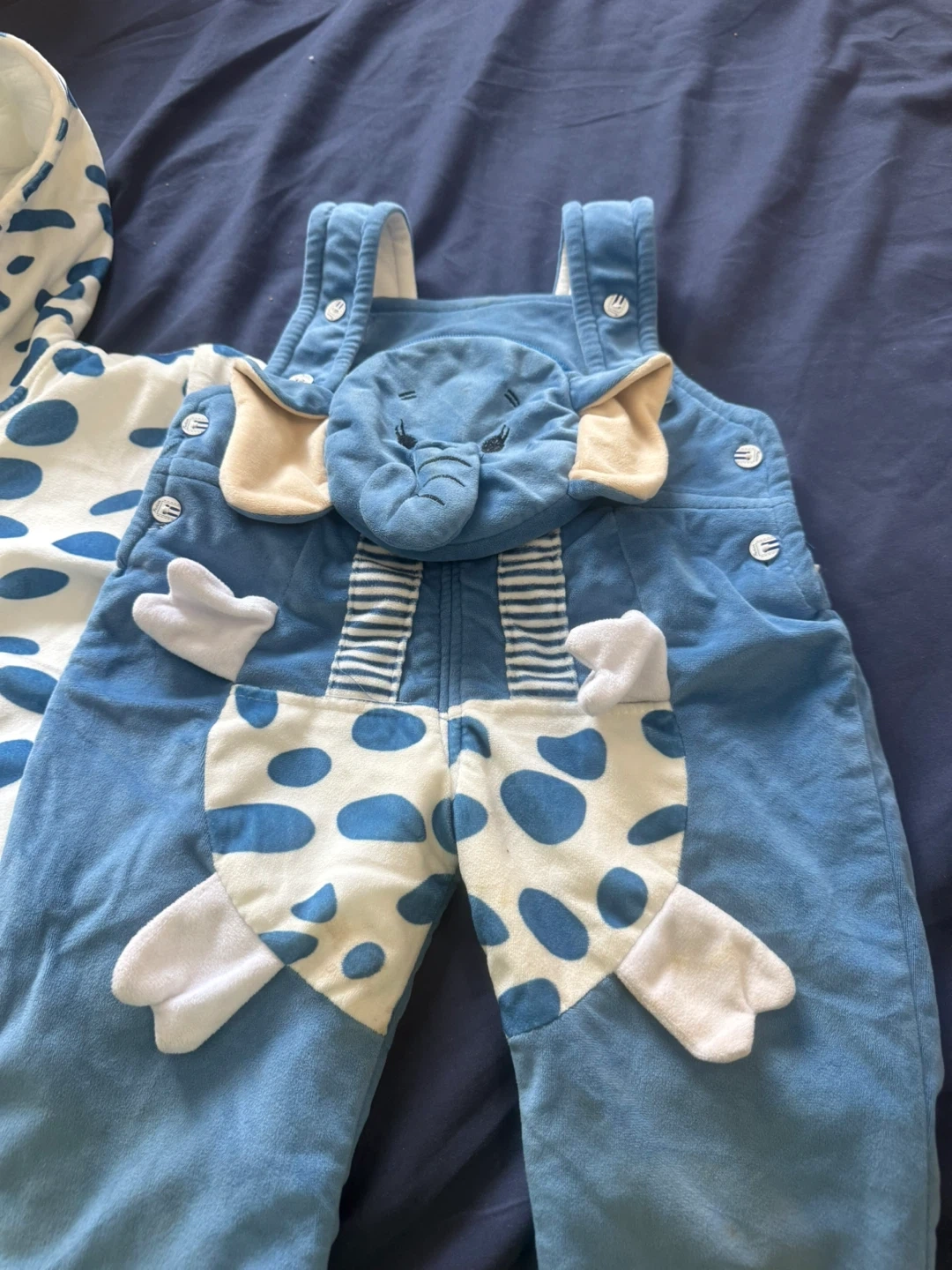 Cute blue overalls with an elephant appliqué and matching hooded jacket with blue polka dots. Soft material for your little one's comfort! Great for keeping warm on chilly days.
