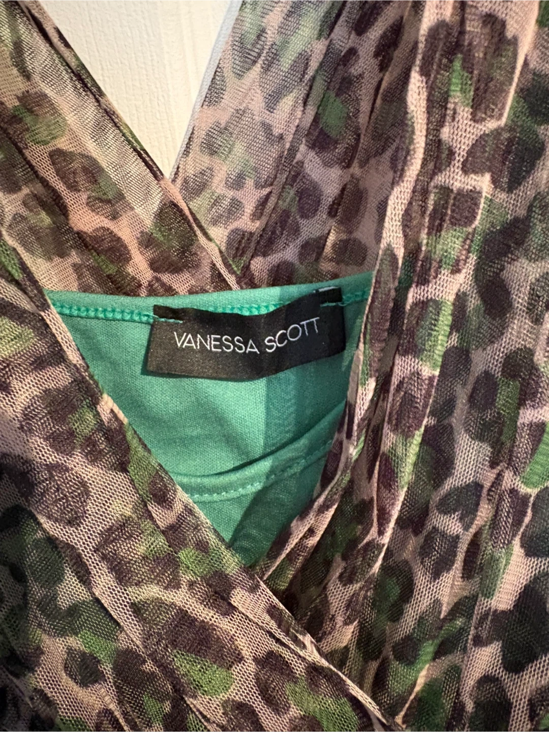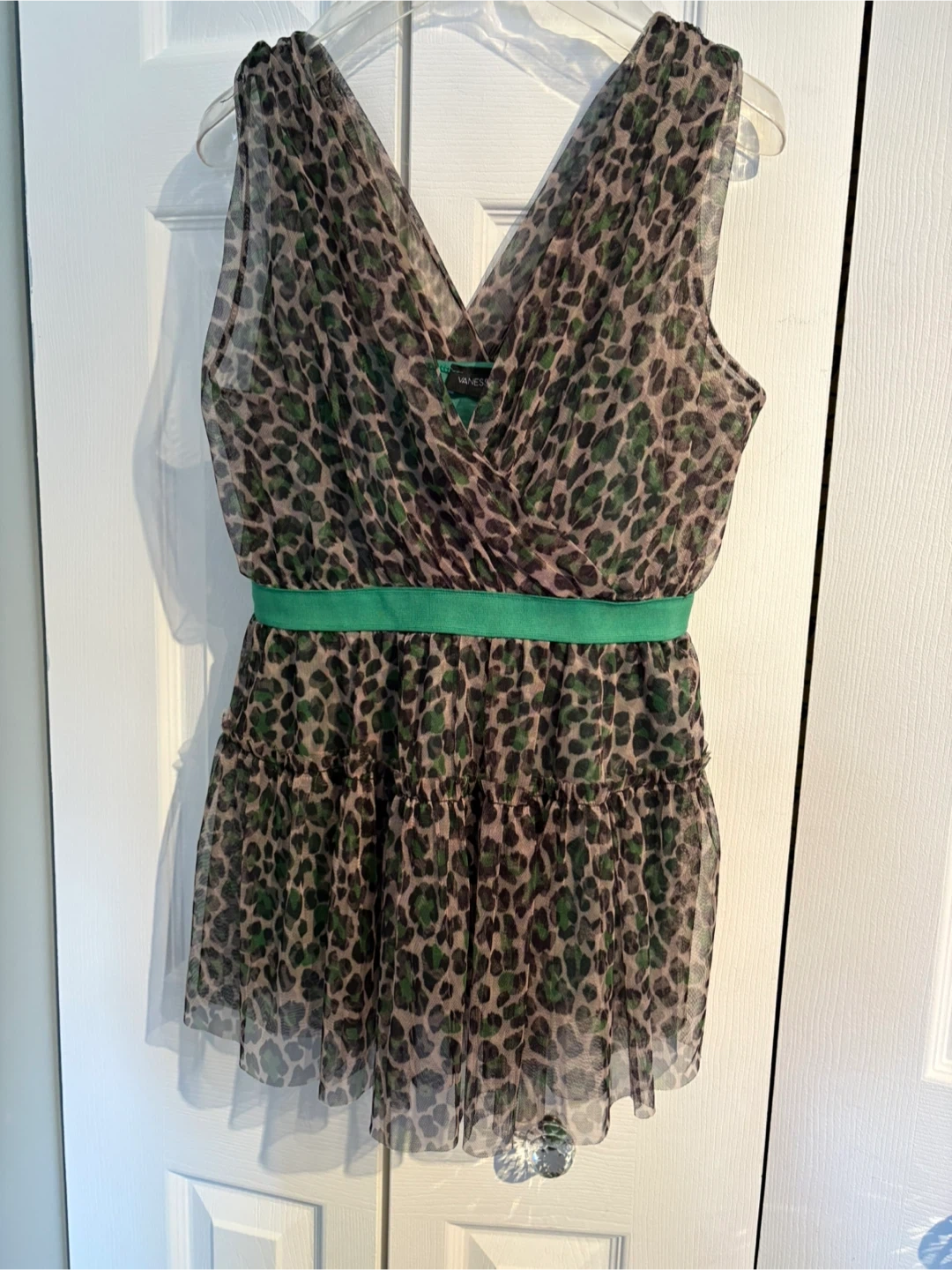 This is a Vanessa Scott sheer top with a leopard print. It features a green elastic waistband and a layered, ruffled hem. The material is lightweight and flows beautifully.