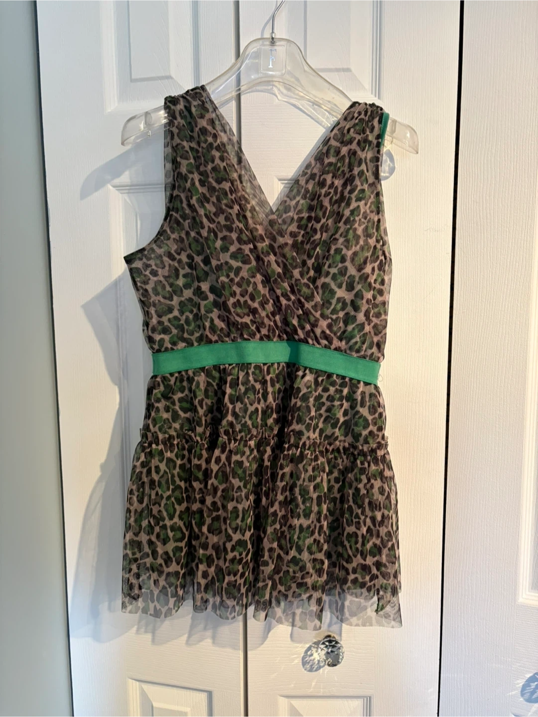 This is a Vanessa Scott sheer top with a leopard print. It features a green elastic waistband and a layered, ruffled hem. The material is lightweight and flows beautifully.