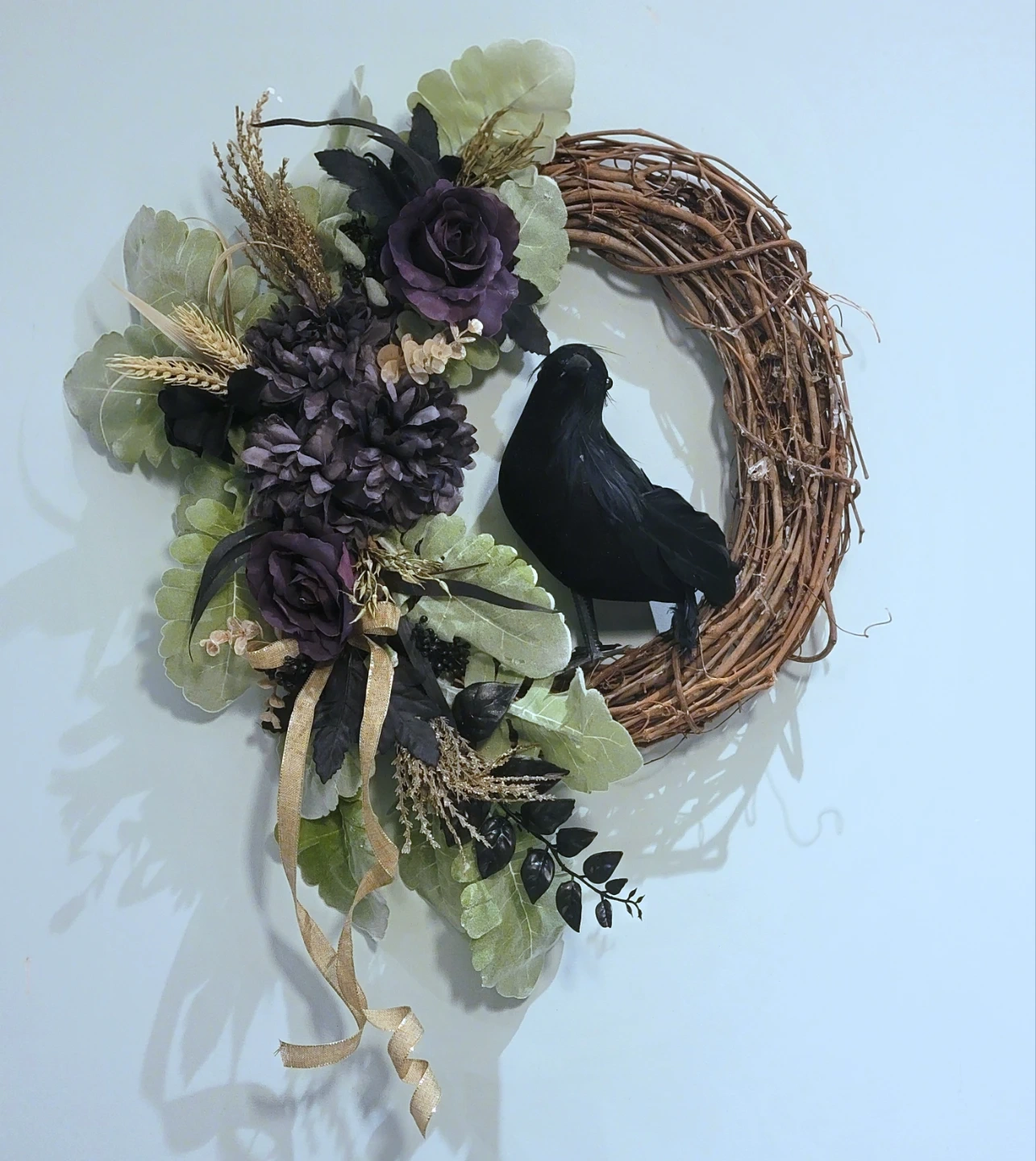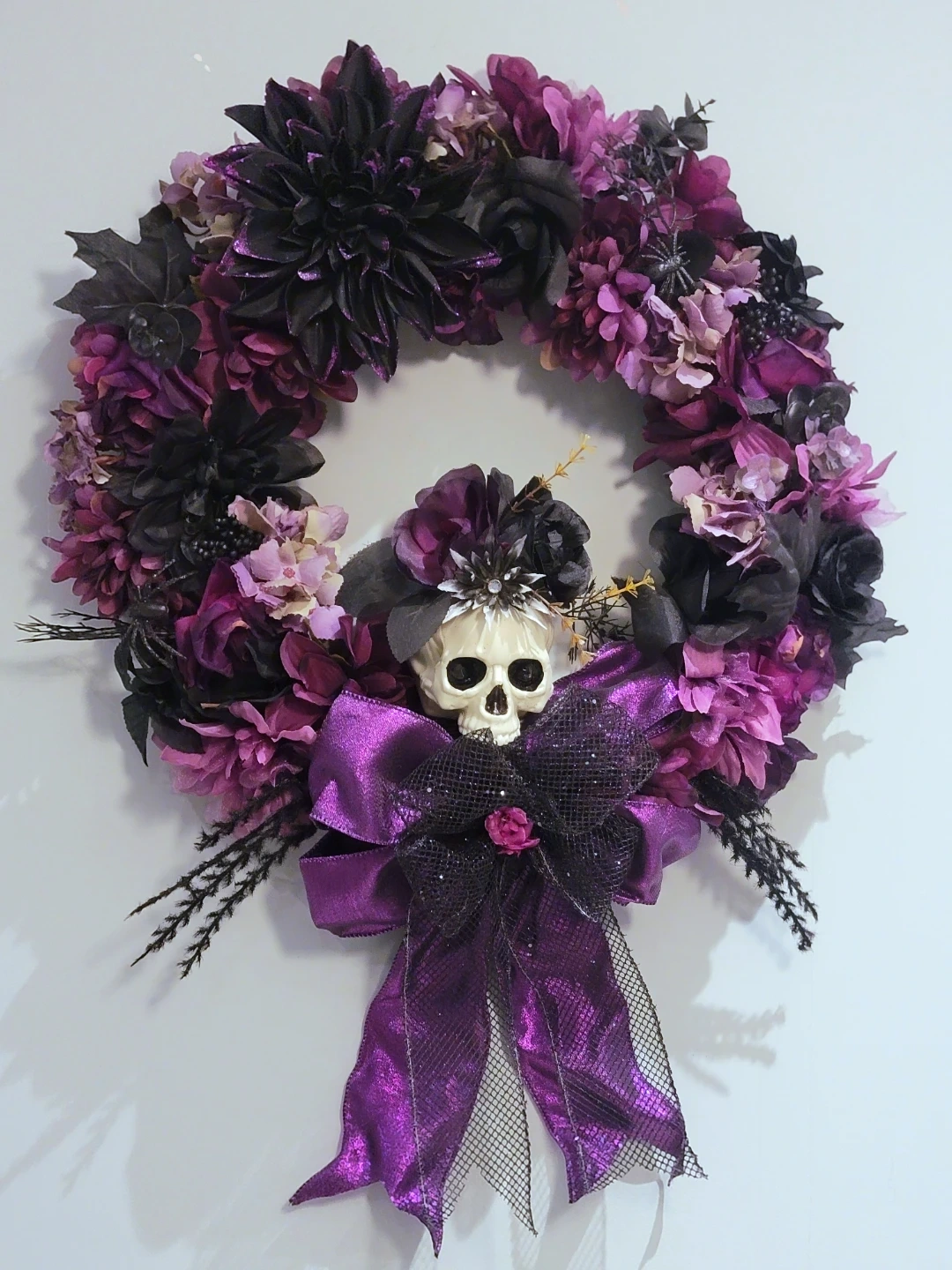 This unique Halloween wreath features a spooky skull centerpiece surrounded by a mix of dark red, black, and purple flowers, with accents of greenery and berries. It's perfect for adding a festive and eerie touch to your front door or home decor during the autumn season. Three wreaths for 20 each or 60 for three